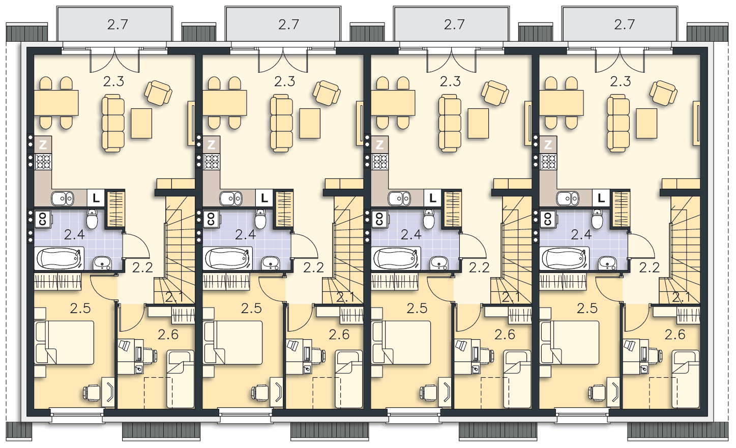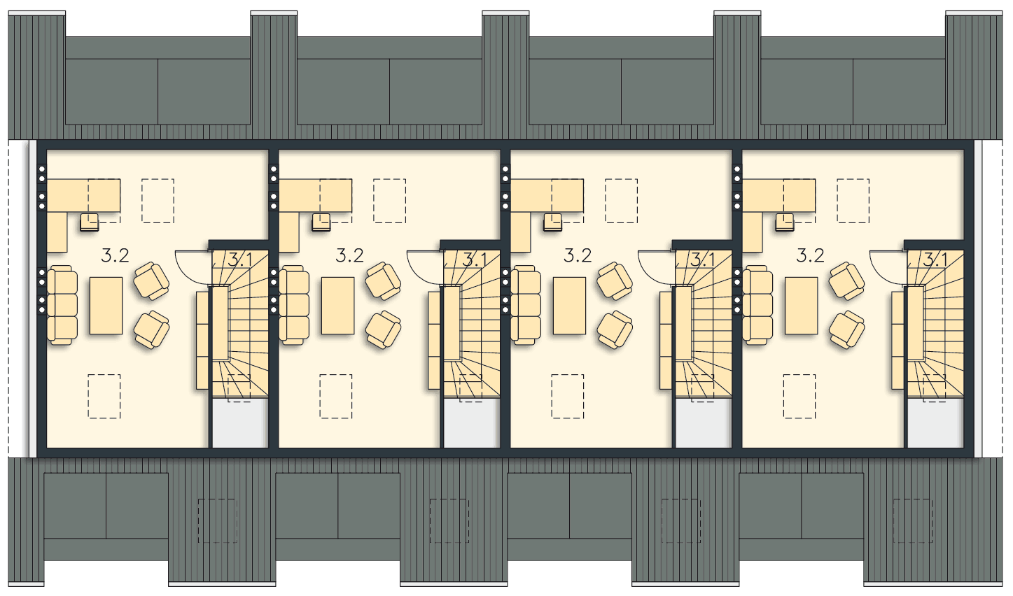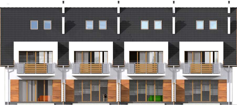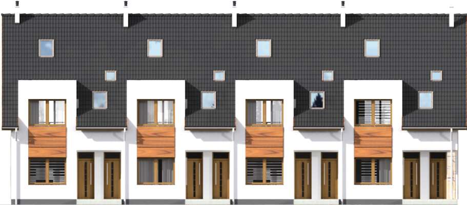 Osiedle energooszczędnych domów wg projektu Fossano, to znakomita propozycja dla developerów, ponieważ każdy segment domu zawiera dwa niezależne mieszkania z osobnymi wejściami. Do mieszkania na drugiej kondygnacji należy także poddasze z dodatkową powierzchnią. Całość sprawia wrażenia zabudowy szeregowej, ale zaproponowany podział na mniejsze powierzchniowo mieszkania, będzie atrakcyjniejszą, łatwiej osiągalną dla klientów ofertą. Bardzo dobrze będzie komponował się na niewielkich działkach miejskich, tworząc klimat nowoczesnego osiedla.