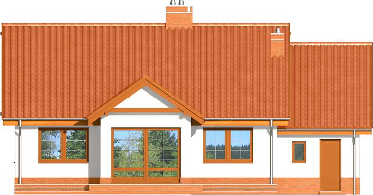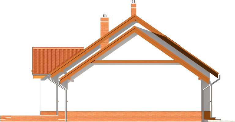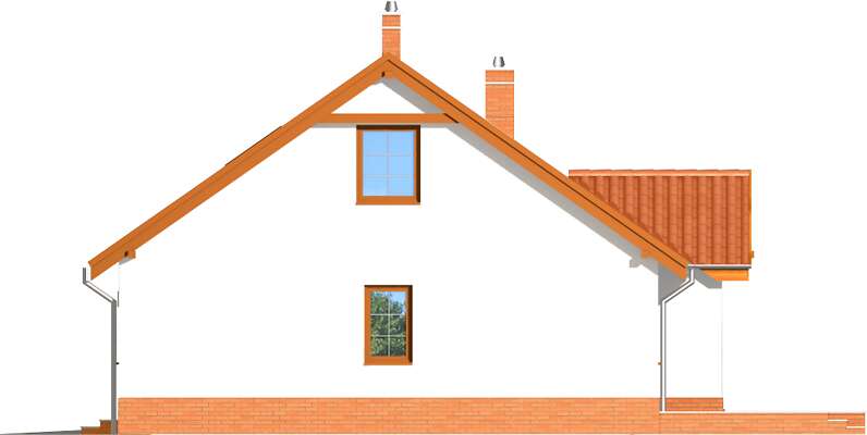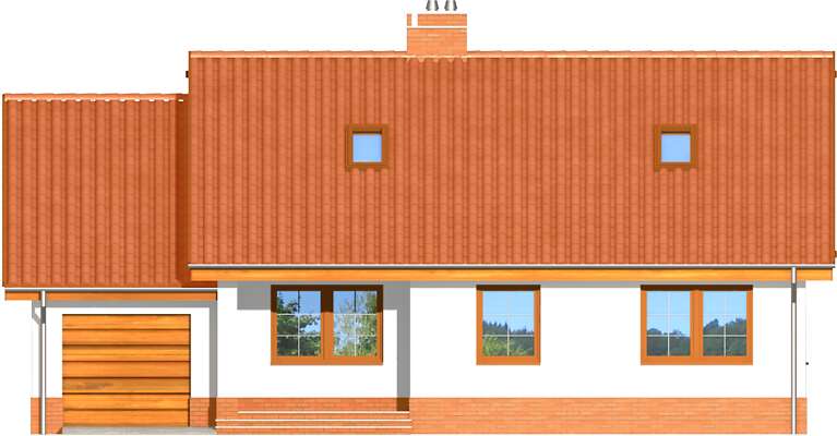 Mały domek może być zaskakująco przestronny. Doskonałym przykładem jest projekt domu Frankfurt IV, w którym dla przyszłych mieszkańców zaprojektowaliśmy dwie wygodne sypialnie, umiejscowione wraz z łazienką nieco na uboczu, a także wyjątkowo duży salon z kominkiem. W tak przestronnym salonie znajdzie się miejsce zarówno dla wygodnych sof przy kominku, jak i jadalni. Z salonu można przejść poprzez duże drzwi balkonowe do ogrodu. Istnieje także możliwość ewentualnego wykorzystania poddasza. Kotłownia została całkowicie wydzielona z części mieszkalnej, ma za to wyjście do ogrodu, a stryszek nad garażem można wykorzystać, jako praktyczny schowek. Ze względu na prostą bryłę jest to dom tani w budowie.