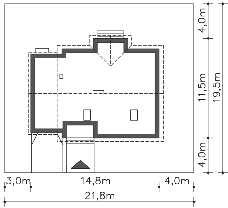Grafika przedstawia minimalne wymiary działki. Aby sprawdzić, czy dom może być realizowany na konkretnej działce należy uzyskać Wypis i Wyrys z Miejscowego Planu Zagospodarowania Przestrzennego lub jeśli na danym terenie nie ma planu – Decyzję o warunkach zabudowy. Wszystkie projekty wymagają adaptacji do warunków miejscowych przez projektanta lokalnego.