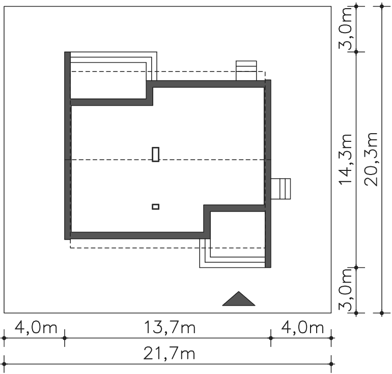 Dodatkowo działka może być mniejsza ponieważ ścianki przy tarasie i wejściu są krótsze.