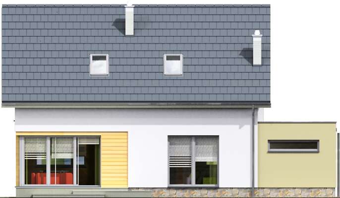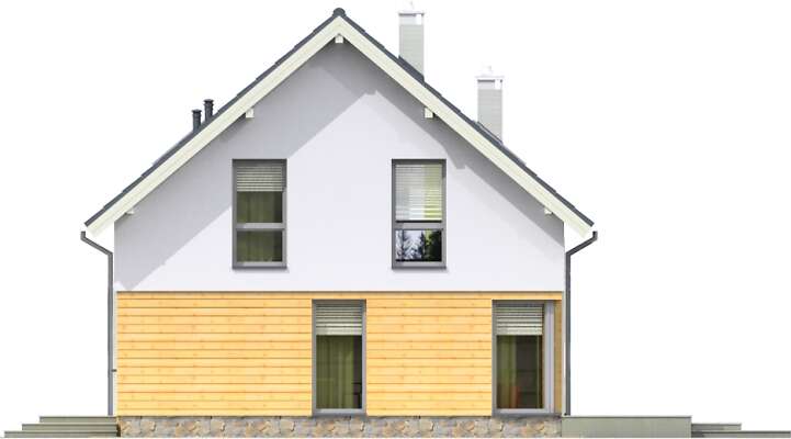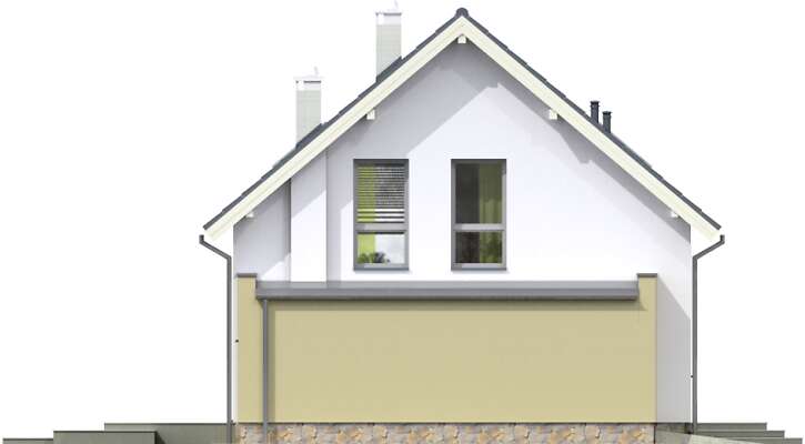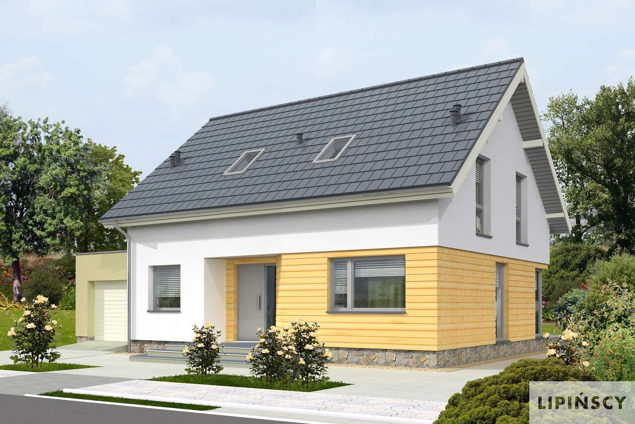 Prosty, niewielki dom z użytkowym poddaszem, którego główną zaletą jest bardzo funkcjonalne rozplanowanie powierzchni, gwarantujące wygodę mieszkańcom. Sercem domu jest duży salon z dużym, narożnym oknem. Z salonem graniczy kuchnia, którą można bardzo ładnie zaaranżować, a obok niej przewidziano podręczną spiżarnię. Na parterze znajduje się również sypialnia i duża łazienka. Poddasze to wyraźnie wydzielona strefa prywatna, z trzema sypialniami i łazienką z oknem. Przy domu znajduje się jednostanowiskowy garaż z pomieszczeniem gospodarczym. Prosta, ładna bryła, przekryta dwuspadowym dachem sprawia, że dom jest niedrogi w realizacji.