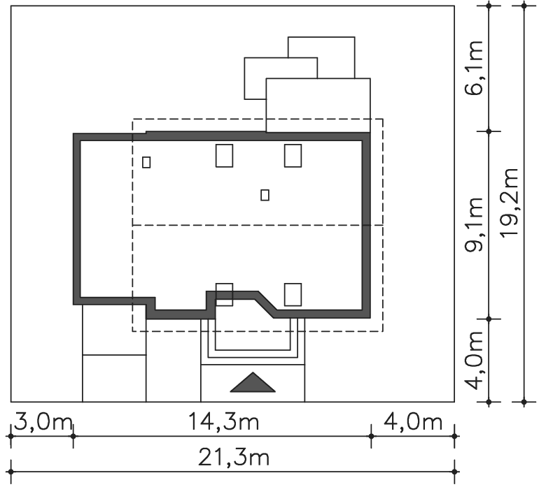 Grafika przedstawia minimalne wymiary działki. Aby sprawdzić, czy dom może być realizowany na konkretnej działce należy uzyskać Wypis i Wyrys z Miejscowego Planu Zagospodarowania Przestrzennego lub jeśli na danym terenie nie ma planu – Decyzję o warunkach zabudowy. Wszystkie projekty wymagają adaptacji do warunków miejscowych przez projektanta lokalnego.