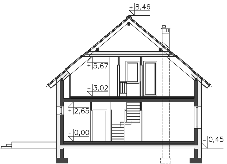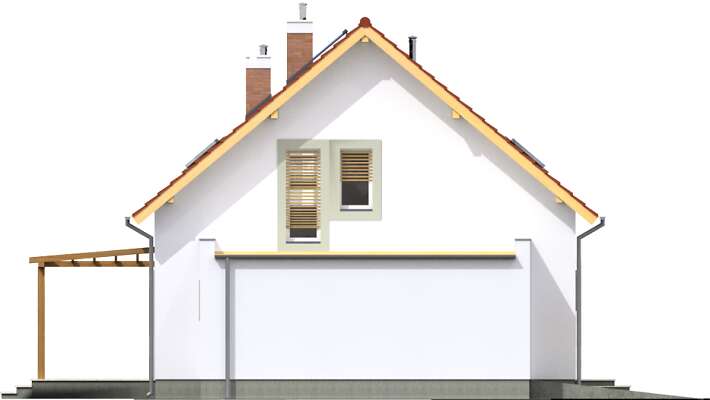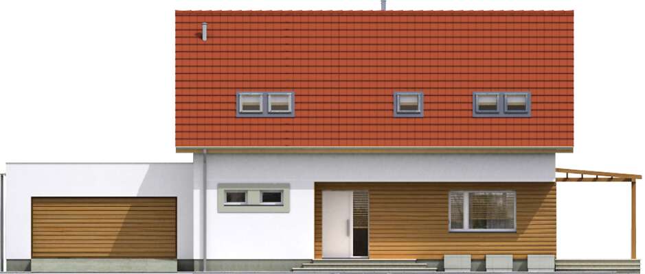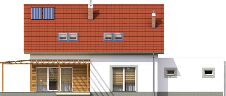 Wygodny dom z użytkowym poddaszem, w standardzie energooszczędnym, w którym – dzięki dużej kotłowni za garażem, istnieje możliwość zastosowania ogrzewania piecem na paliwo stałe. Parter to obszerna strefa wspólna, z salonem z kominkiem, połączonym z kuchnią, w której umieszczono praktyczną wyspę z kuchenką. Obok kuchni zaplanowano przydatną spiżarnię. Duże przeszklenia w salonie sprawiają, że pomieszczenie jest zawsze pełne światła dziennego. Na parterze znajduje się również duża sypialnia i wygodna łazienka. Piękny, zadaszony taras jest doskonałym, miejscem relaksu. Na poddaszu, w strefie prywatnej znajdą się trzy ustawne sypialnie, garderoba, duża łazienka i wc.