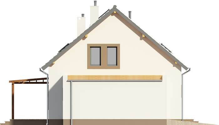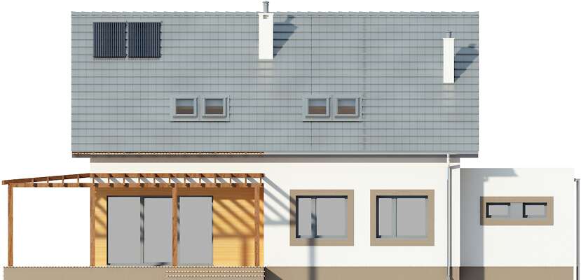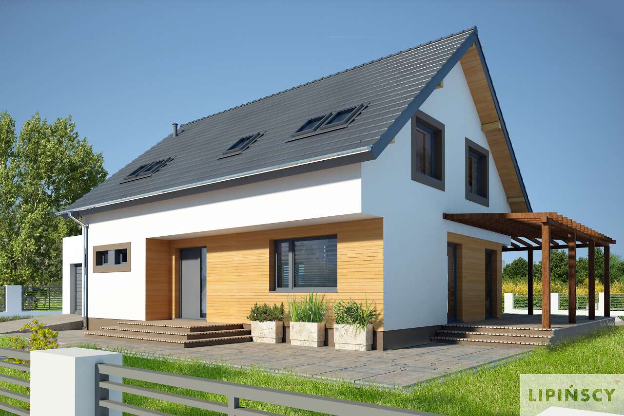 Wygodny, przestronny dom energooszczędny, z użytkowym poddaszem i jednostanowiskowym garażem. Centrum domu stanowi duży salon z kominkiem i przeszklonym wyjściem na taras i otwarta na niego kuchnia, z centralnie usytuowaną wyspą. Na parterze znajdują się również dwie sypialnie oraz duża, jasna łazienka. Z wnętrza domu można przejść do garażu, za którym znajduje się pomieszczenie gospodarcze z kotłownią. Poddasze to trzy duże, ustawne sypialnie, toaleta oraz duża, doświetlona oknami połaciowymi łazienka. Prosta, elegancka bryła, zyskuje nowoczesnego rysu dzięki drewnianym elementom w elewacji.
