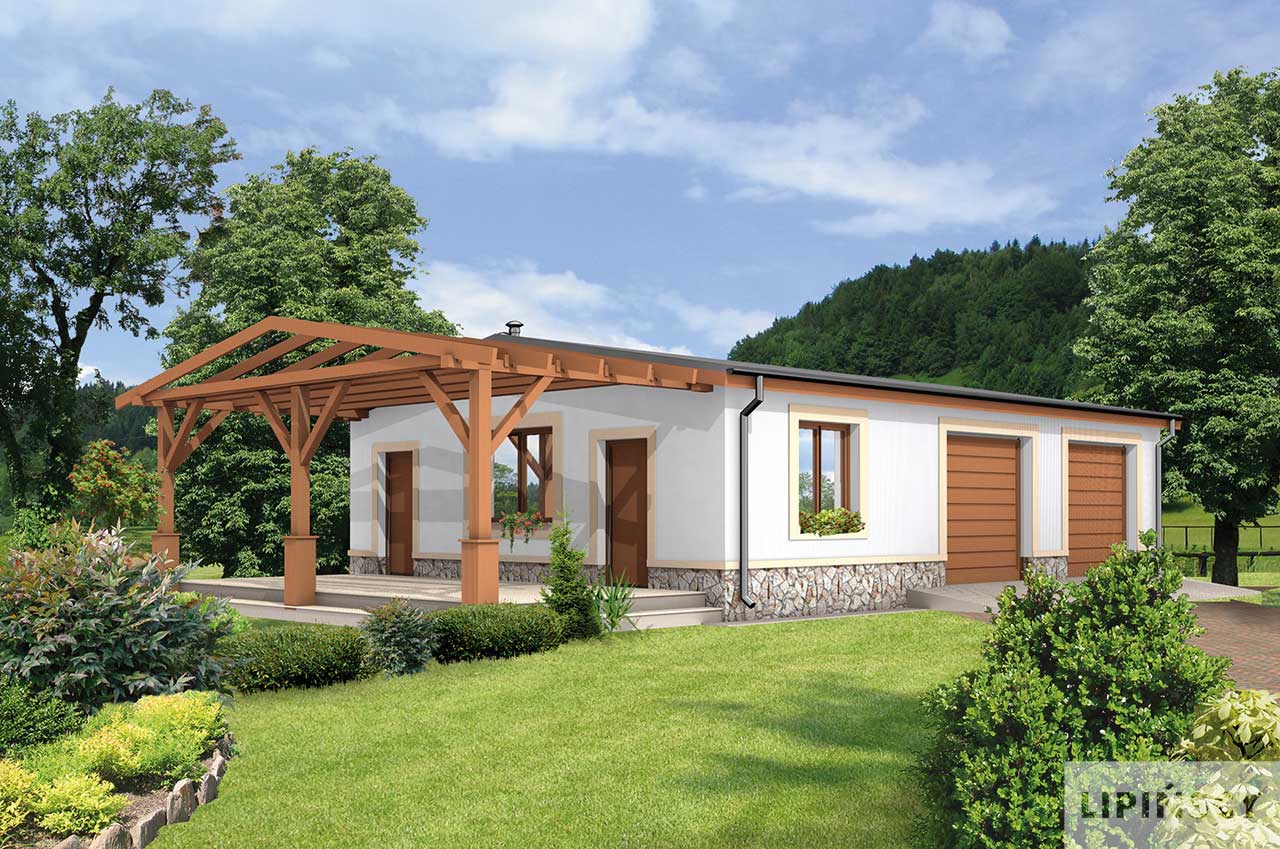 Garaż wolnostojący, dwustanowiskowy z ciągiem mieszkalnym, pomieszczeniem gospodarczym i wiatą.