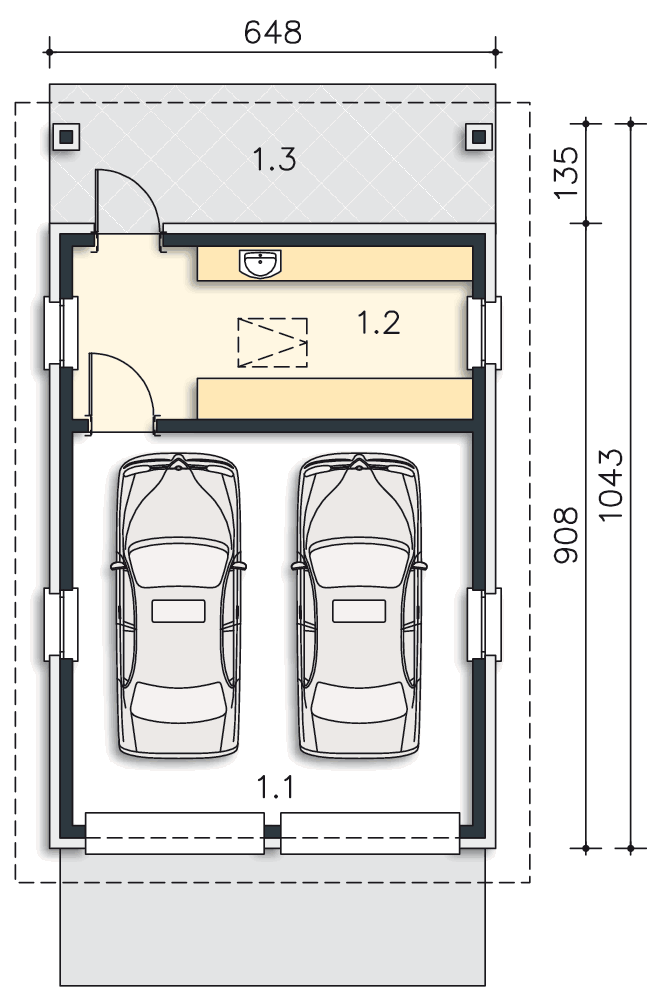 Projekt garażu na dwa stanowiska, z wydzielonym pomieszczeniem gospodarczym. Budynek można zaadaptować na cele gospodarcze. Do wykorzystania jest także przestrzeń na poddaszu, do której prowadzą składane schody.Projekt garażu na dwa stanowiska, z wydzielonym pomieszczeniem gospodarczym. Budynek można zaadaptować na cele gospodarcze. Do wykorzystania jest także przestrzeń na poddaszu, do której prowadzą składane schody.