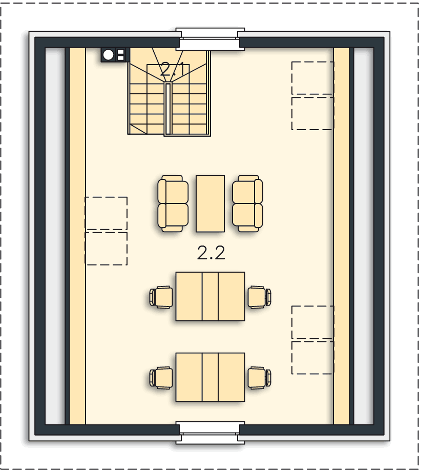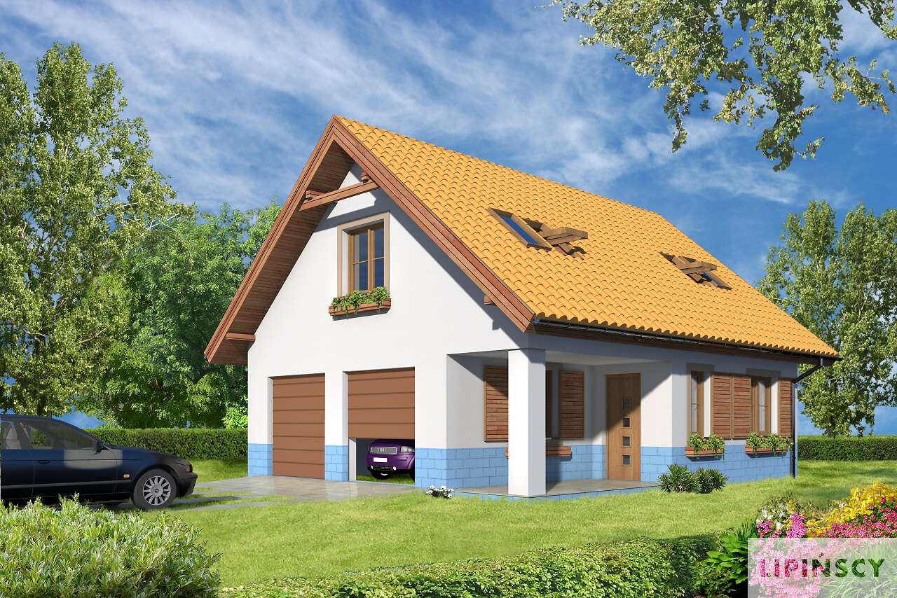 Interesująca propozycja garażu wolnostojącego z miejscem na dwa samochody i zapleczem biurowym. W zależności od potrzeb pomieszczenie na parterze i poddasze można użytkować jako biuro, zaciszną pracownię lub lokal usługowy.
