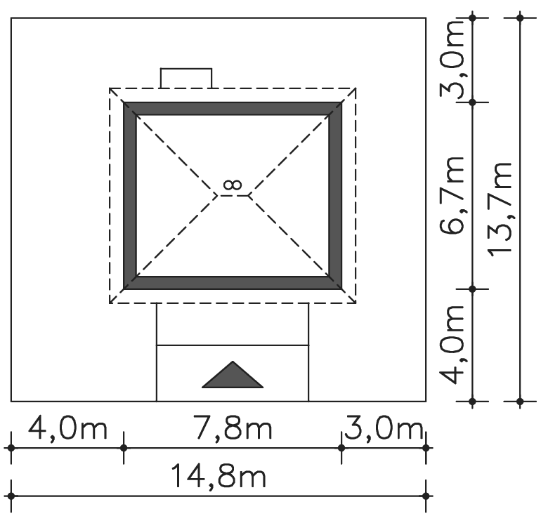 Grafika przedstawia minimalne wymiary działki. Aby sprawdzić, czy dom może być realizowany na konkretnej działce należy uzyskać Wypis i Wyrys z Miejscowego Planu Zagospodarowania Przestrzennego lub jeśli na danym terenie nie ma planu – Decyzję o warunkach zabudowy. Wszystkie projekty wymagają adaptacji do warunków miejscowych przez projektanta lokalnego.