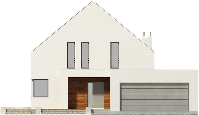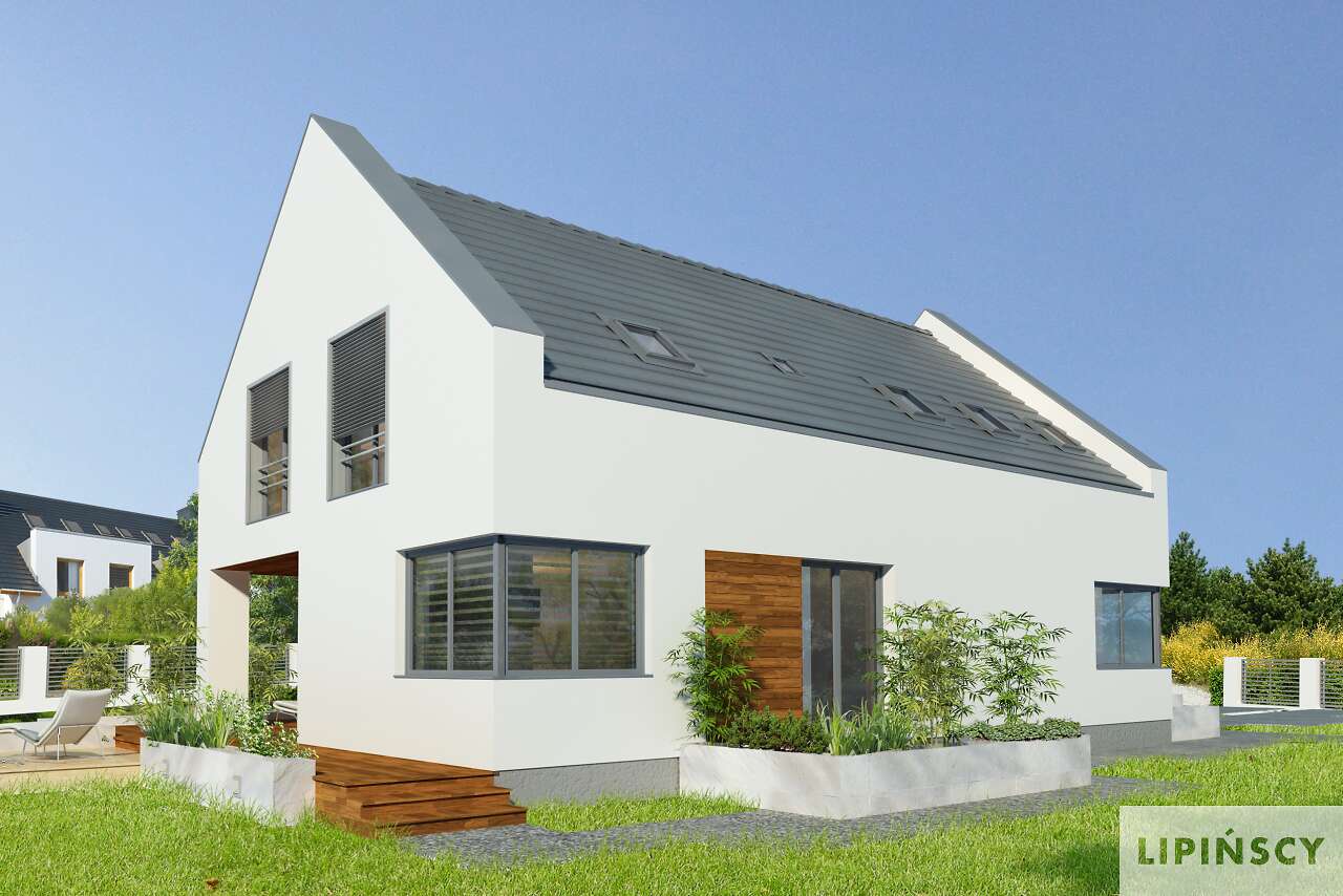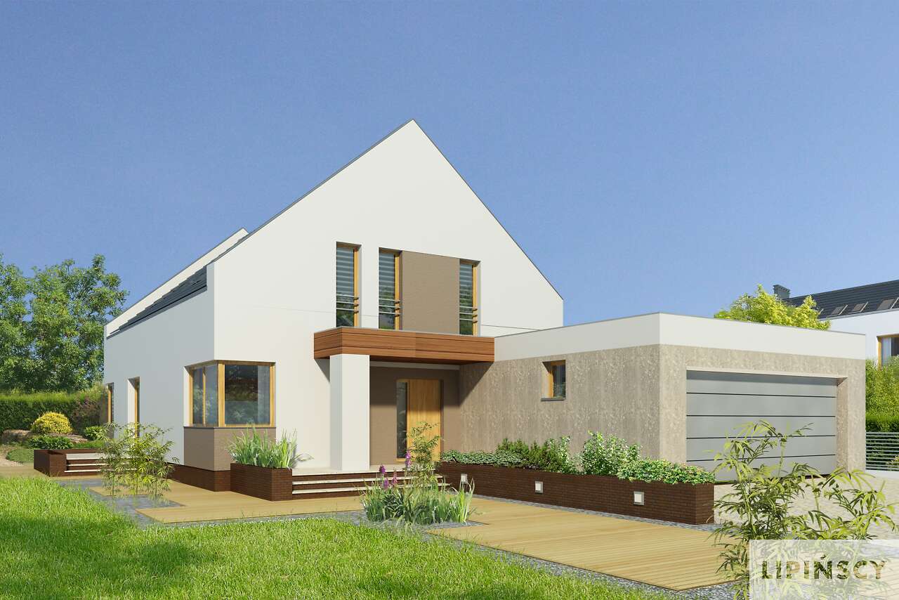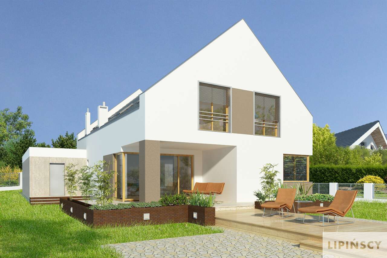 Nowa odsłona projektu Garda z garażem na dwa auta i kilkoma zmianami funkcjonalnymi. Część główną domu stanowi przestronny salon z jadalnią i otwartą kuchnią. Z salonu można wyjść na zadaszony taras, gdzie zmieści się duży, gościnny stół. Drugi niewielki taras zlokalizowano z boku domu, z wyjściem z jadalni. Na parterze mieści się również osobny pokój, łazienka, kotłownia i garderoba przy wiatrołapie. Z domu przewidziano wejście do dwustanowiskowego garażu, w którym znajduje się pomieszczenie gospodarcze. Poddasze to trzy sypialnie, każda z garderobami, a jedna również z prywatną łazienką. Na poddaszu znajduje się również wygodna łazienka wspólna oraz pralnia.