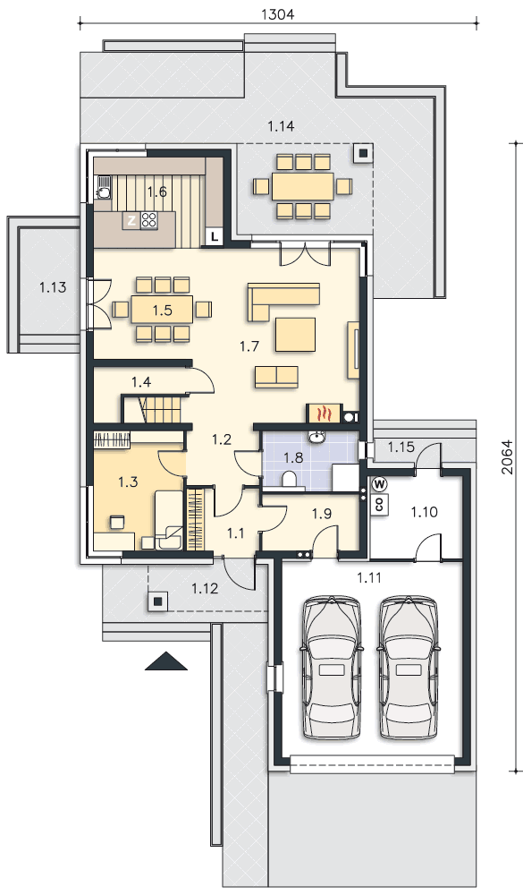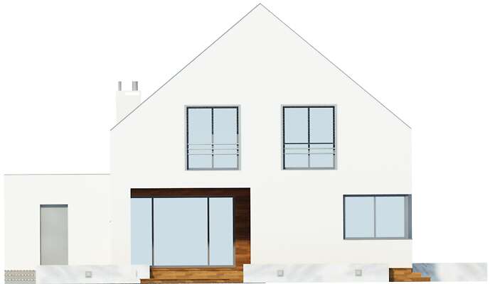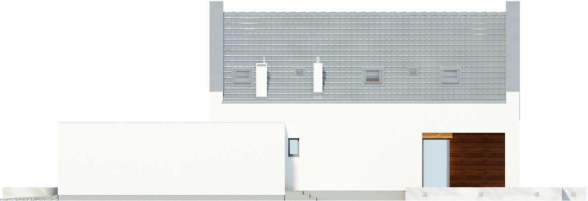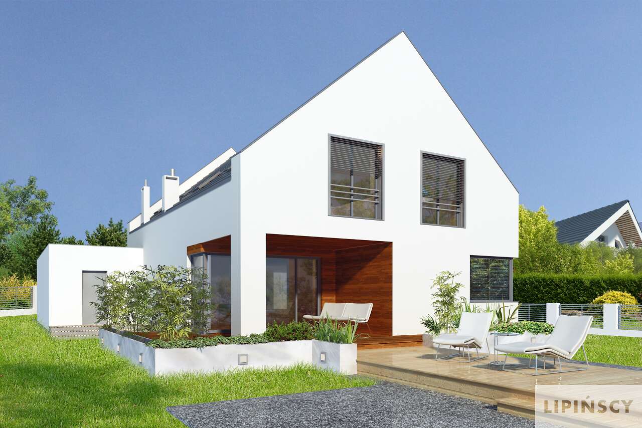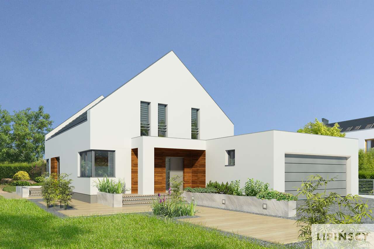Nowa odsłona projektu Garda z garażem na dwa auta i kilkoma zmianami funkcjonalnymi. Część główną domu stanowi przestronny salon z jadalnią i otwartą kuchnią. Z salonu można wyjść na zadaszony taras, gdzie zmieści się duży, gościnny stół. Drugi niewielki taras zlokalizowano z boku domu, z wyjściem z jadalni. Na parterze mieści się również osobny pokój, łazienka, kotłownia i garderoba przy wiatrołapie. Z domu przewidziano wejście do dwustanowiskowego garażu, w którym znajduje się pomieszczenie gospodarcze. Poddasze to trzy sypialnie, każda z garderobami, a jedna również z prywatną łazienką. Na poddaszu znajduje się również wygodna łazienka wspólna oraz pralnia.