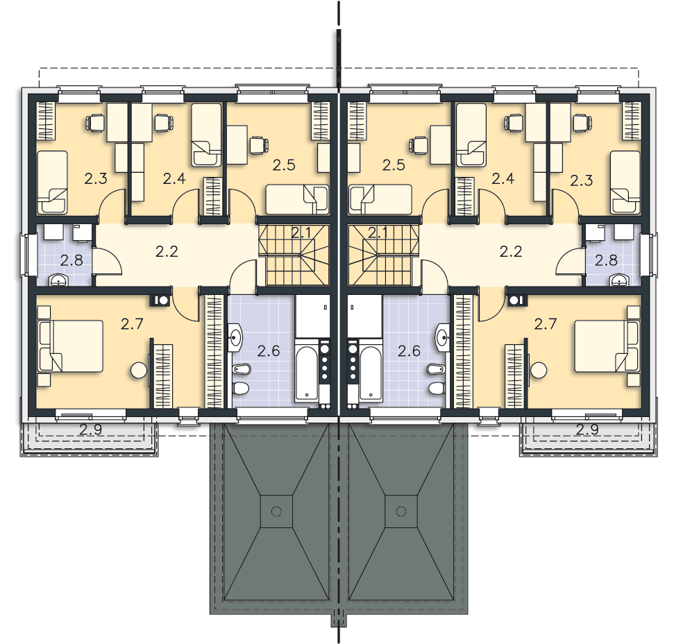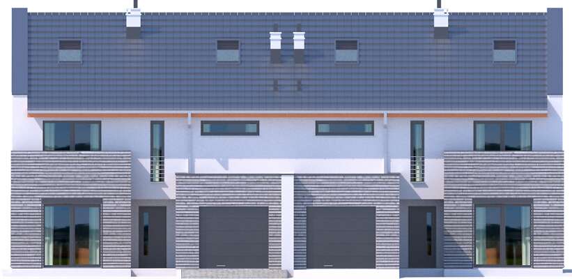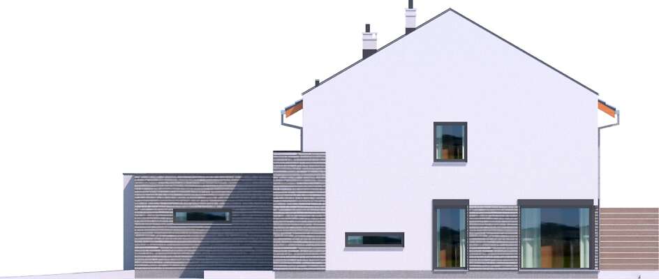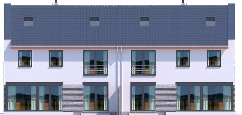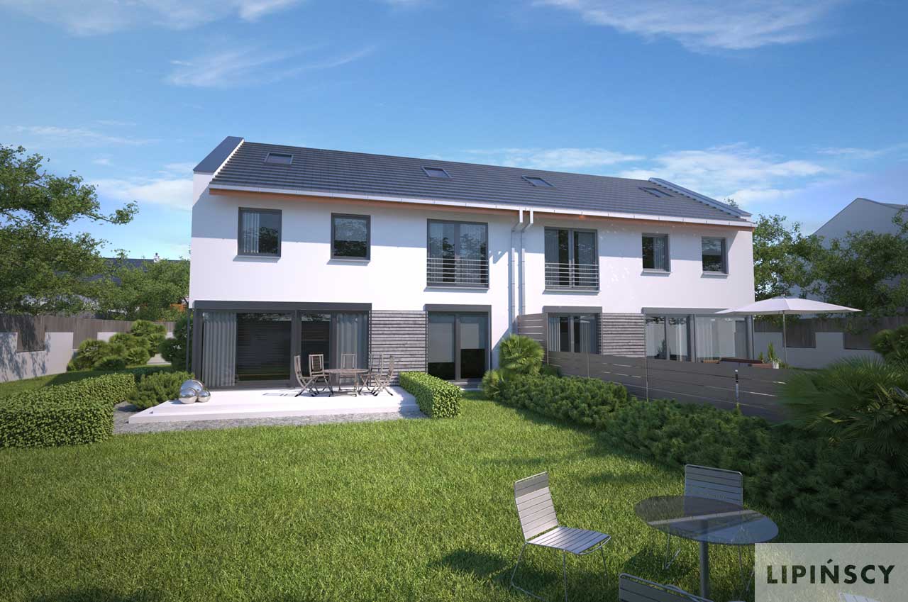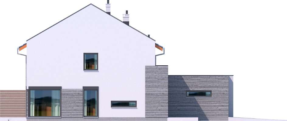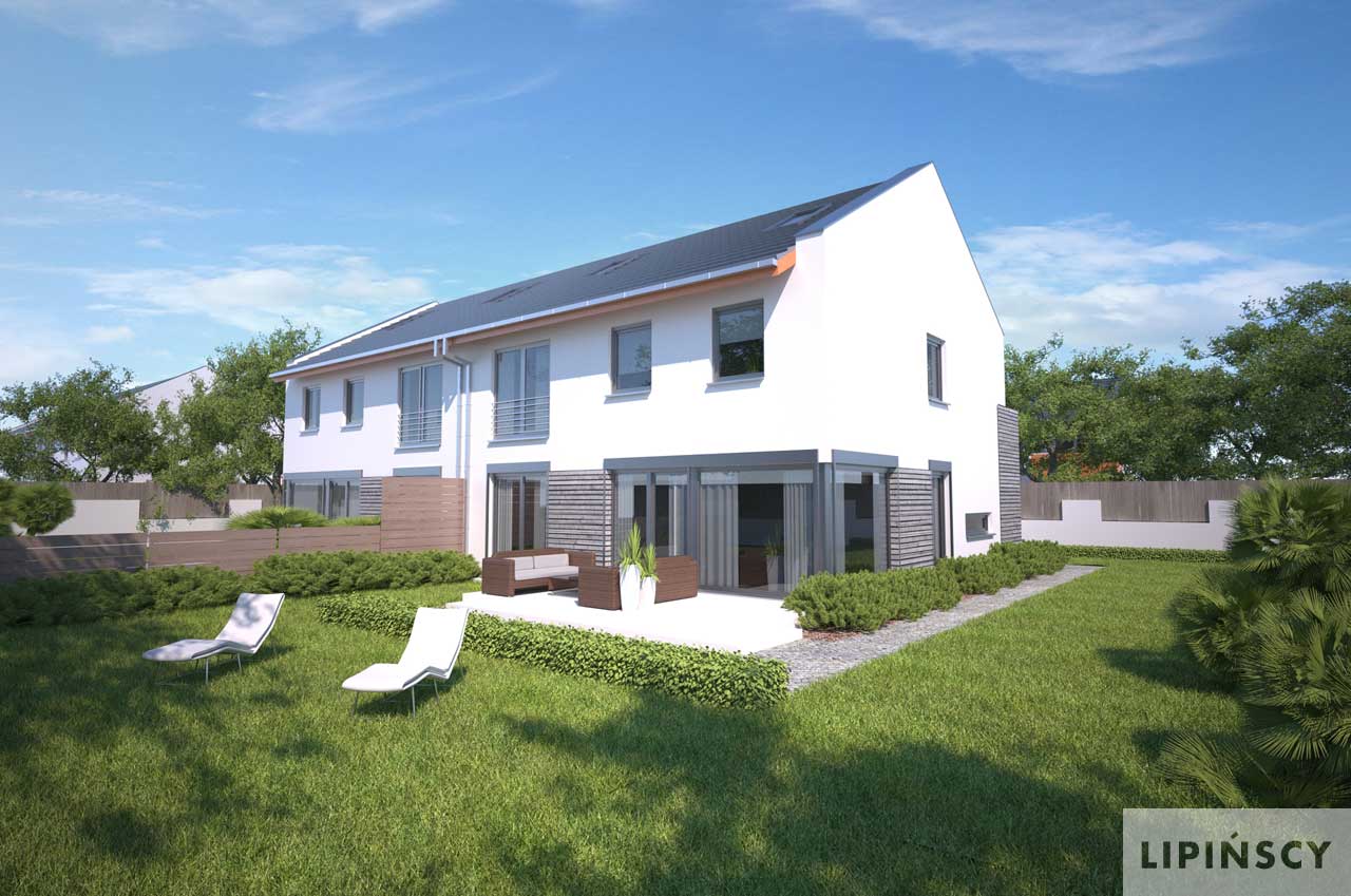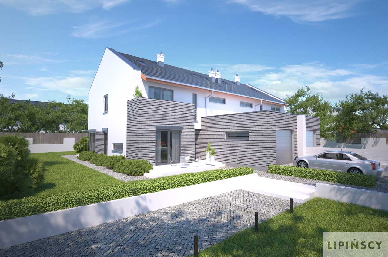 Energooszczędny dom w zabudowie bliźniaczej, o nowoczesnym rysie, który - dzięki wysunięciu garażu do przodu, zmieści się na niezbyt szerokiej działce. Zamknięta kuchnia, zlokalizowana od strony frontowej, znajdzie uznanie wśród zwolenników wyraźnego oddzielenia tego pomieszczenia od salonu. Ozdobą wygodnego salonu z kominkiem jest duże, narożne okno, doskonale doświetlające wnętrze. Na parterze przewidziano także pokój dla gości lub gabinet oraz łazienkę. Za garażem znajduje się kotłownia. Poddasze podzielono między cztery sypialnie, w tym jedną z własną garderobą, dużą, wygodną łazienką oraz pralnię. Drewniane pergole stanowią ładny element dekoracyjny tarasu oraz chronią go przed nadmiernym słońcem.