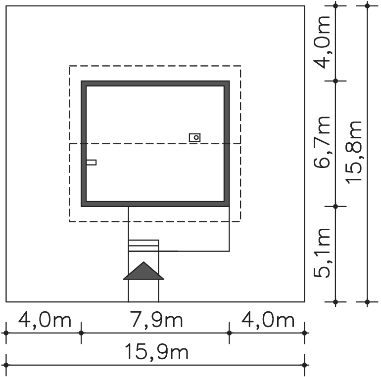 Grafika przedstawia minimalne wymiary działki. Aby sprawdzić, czy dom może być realizowany na konkretnej działce należy uzyskać Wypis i Wyrys z Miejscowego Planu Zagospodarowania Przestrzennego lub jeśli na danym terenie nie ma planu – Decyzję o warunkach zabudowy. Wszystkie projekty wymagają adaptacji do warunków miejscowych przez projektanta lokalnego.