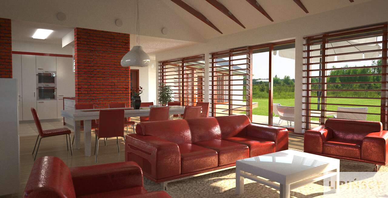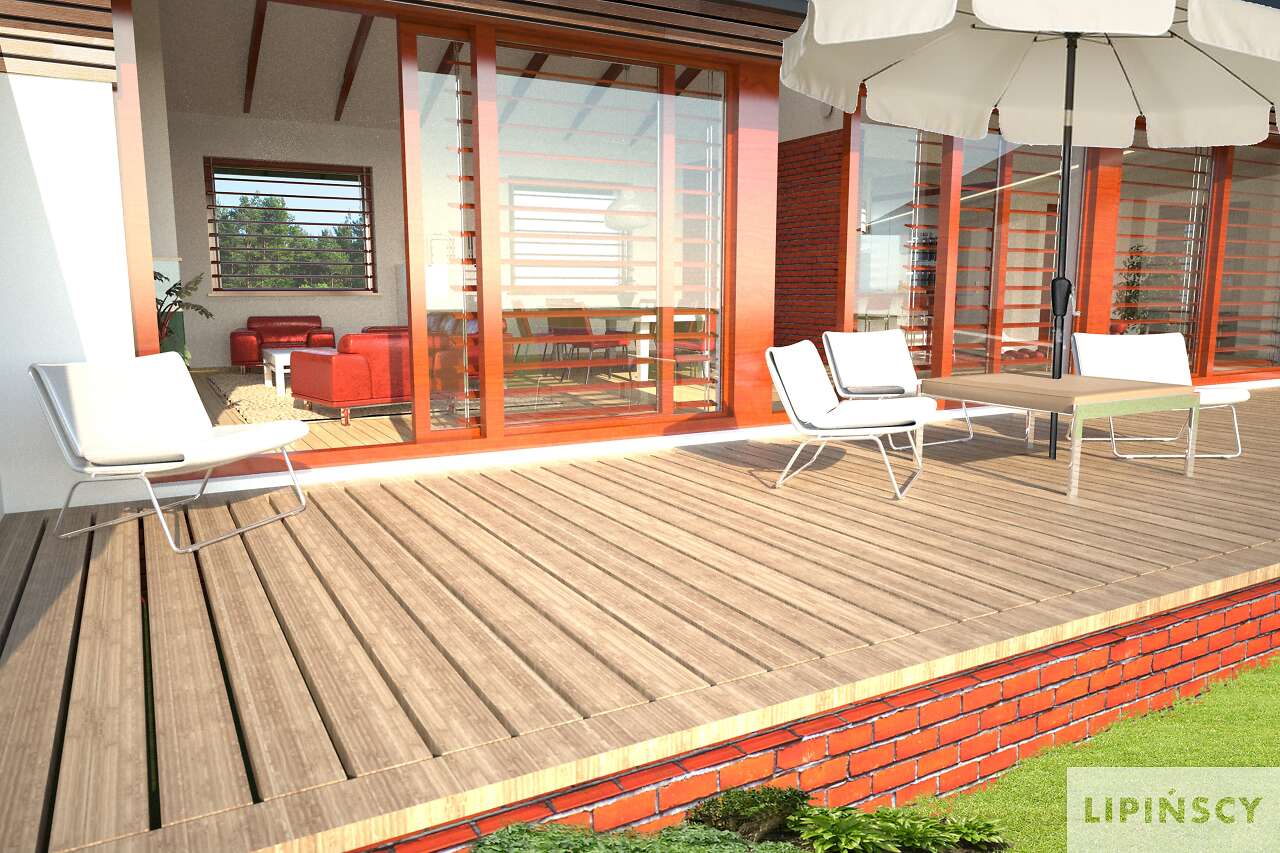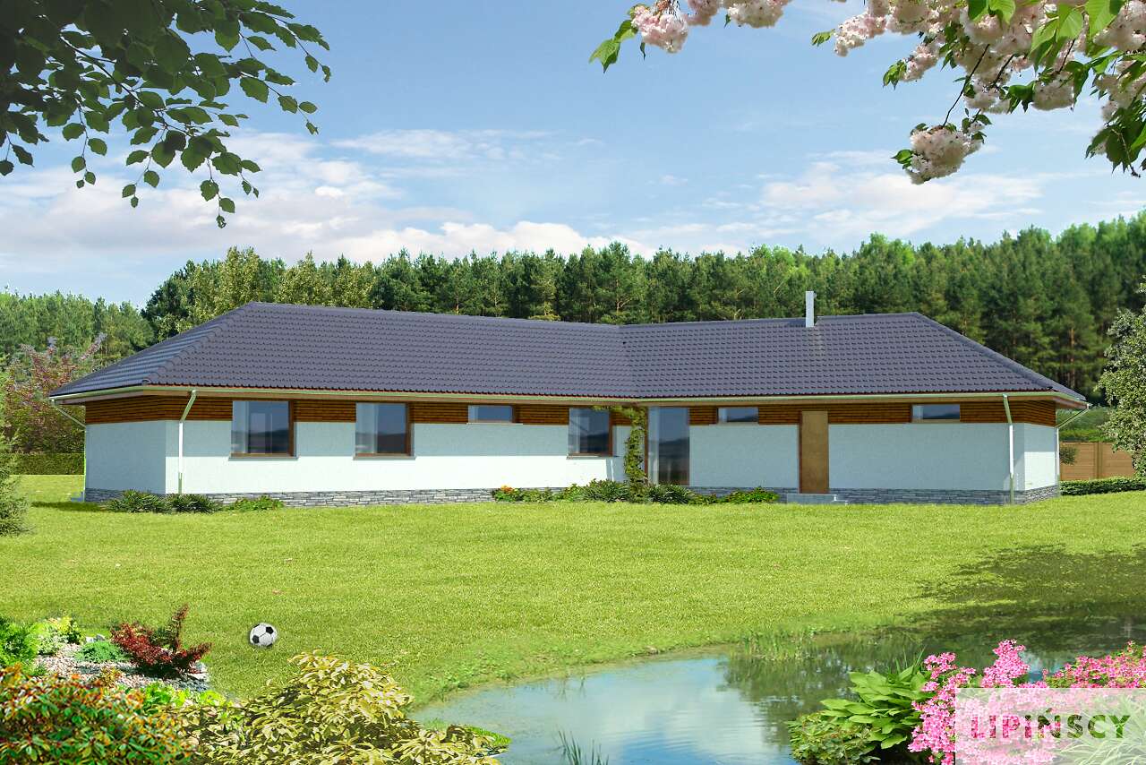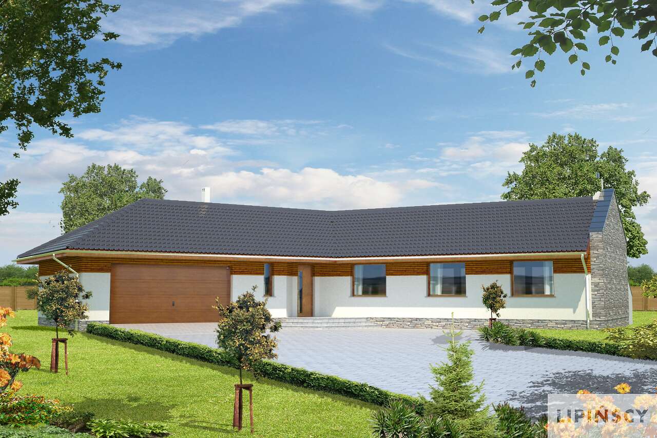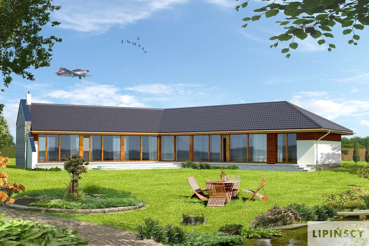 Wyjątkowy dom energooszczędny, o rozłożystej bryle, adresowany do inwestorów ceniących wyjątkowe rozwiązania i bliski kontakt z naturą. Wnętrze podzielono na wspólną strefę dzienną, z otwartą na duży salon kuchnią . Bezpośrednio przy wejściu znajduje się gabinet, w części gospodarczej zaś pralnia, pomieszczenie gospodarcze i garaż na dwa stanowiska. Duży hol można wykorzystać jako wewnętrzny mini ogród. Część nocna, ulokowana w osobnym skrzydle domu to cztery wygodne sypialnie, w tym jedna z własną łazienką i garderobą. Uwagę zwraca przeszklona ściana z widokiem na ogród, która nie tylko jest ozdobą domu, ale także doskonale doświetla wnętrze. W projekcie przewidziano ogrzewanie pompą ciepła.