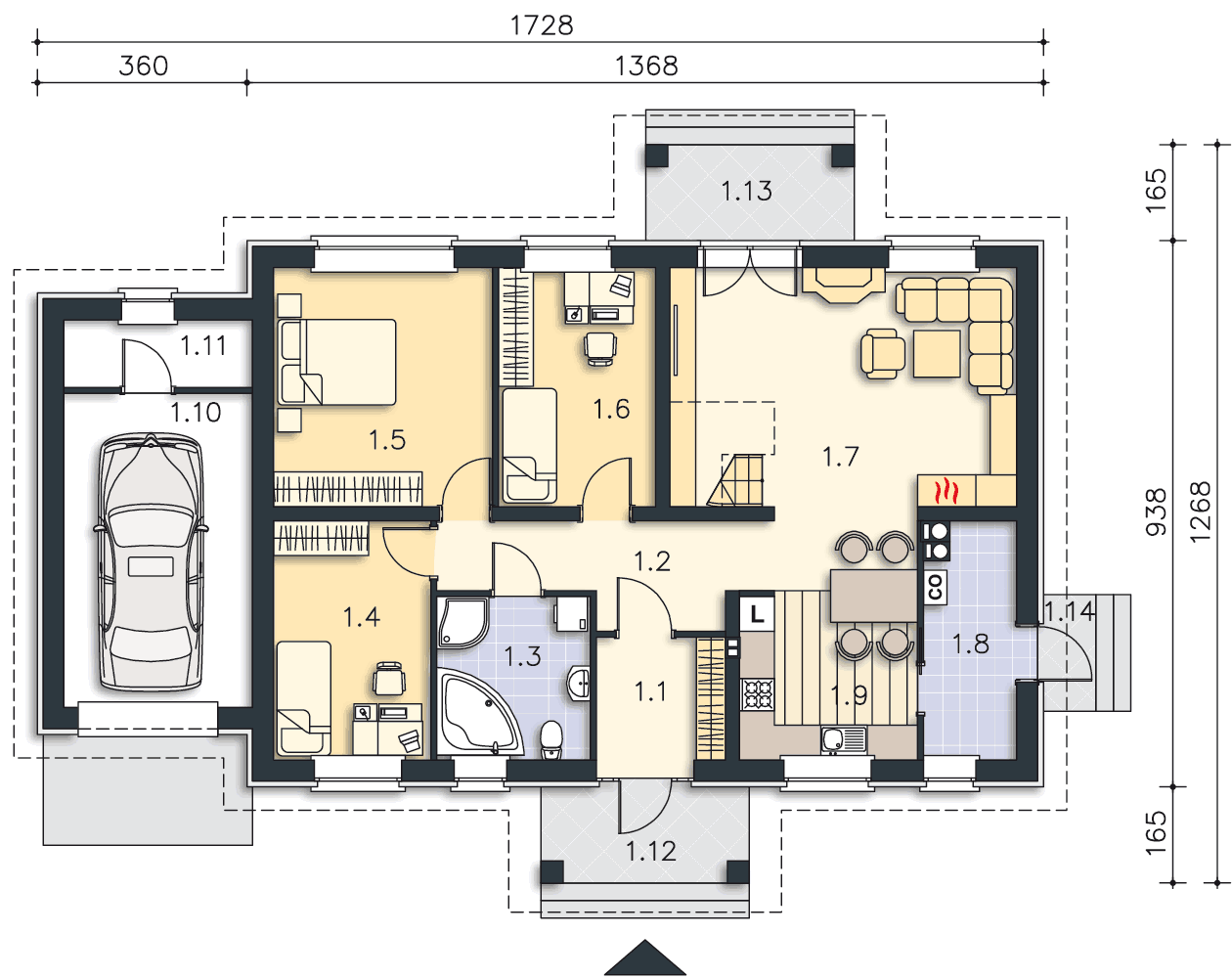 Aby kotłownia mogła być na paliwo stałe, musi mieć minimum 2x2 m. W tym projekcie do tej szerokości potrzebujemy 0,5 m. Można zatem zmniejszyć kuchnię, albo poszerzyć budynek o tą część. Zmianę taką można wprowadzić na etapie adaptacji.