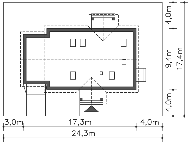Grafika przedstawia minimalne wymiary działki. Aby sprawdzić, czy dom może być realizowany na konkretnej działce należy uzyskać Wypis i Wyrys z Miejscowego Planu Zagospodarowania Przestrzennego lub jeśli na danym terenie nie ma planu – Decyzję o warunkach zabudowy. Wszystkie projekty wymagają adaptacji do warunków miejscowych przez projektanta lokalnego.