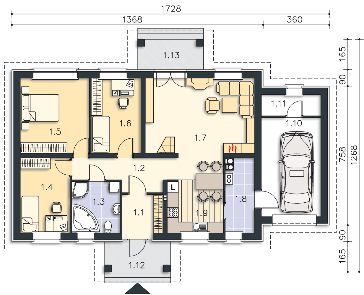 Pomieszczenie 1.11 można powiększyć, ale wtedy już trzeba zrównać bryłę garażu i domu - przynajmniej z tyłu. W tak powiększonym pomieszczeniu kotłownia bez problemu się zmieści.