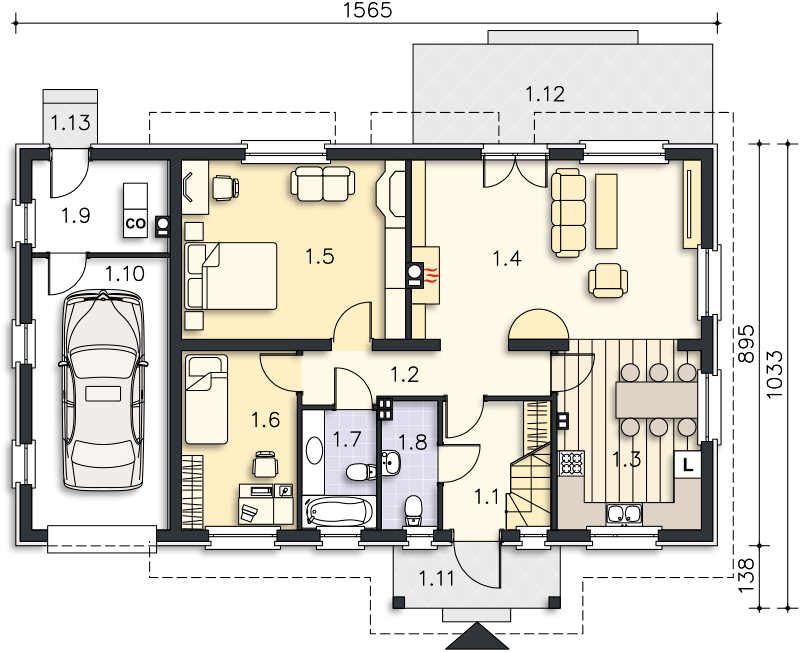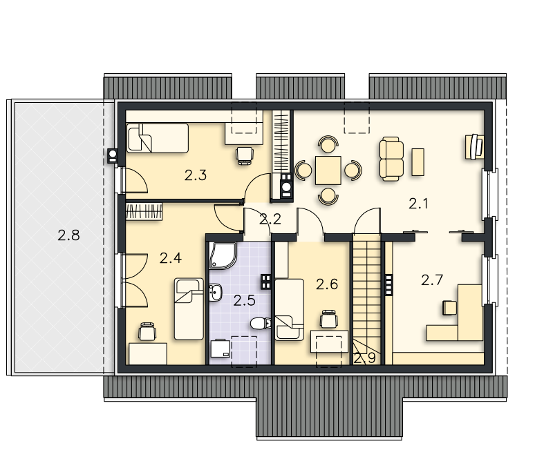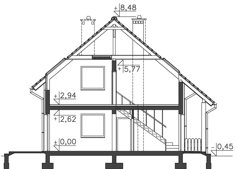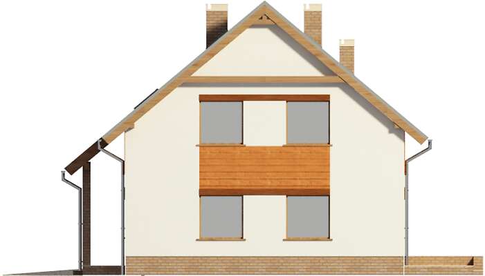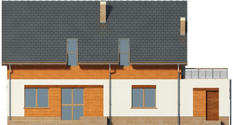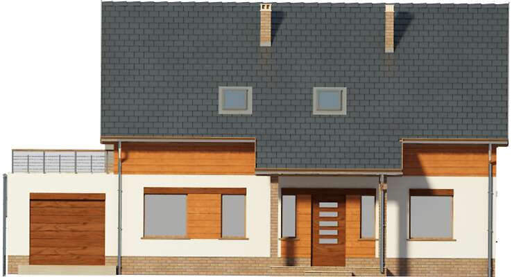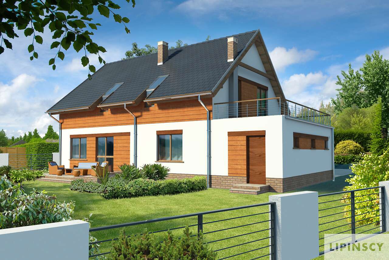 Prosty dom z użytkowym poddaszem, który, dzięki usytuowaniu schodów w wiatrołapie, może być realizowany dwuetapowo lub być domem wielopokoleniowym. Wnętrze bardzo funkcjonalnie rozplanowano i podzielono na parterze na duży salon z kominkiem, wygodną kuchnię z miejscem na stół, dwie sypialnie, łazienkę i pomieszczenie gospodarcze. Na poddaszu znajdują się cztery sypialnie, duża łazienka i salon, w którym, w razie potrzeby, można wydzielić aneks kuchenny. Do domu przynależy garaż, na dachu którego jest duży taras, a za garażem wydzielono kotłownię z niezależnym wyjściem na zewnątrz.