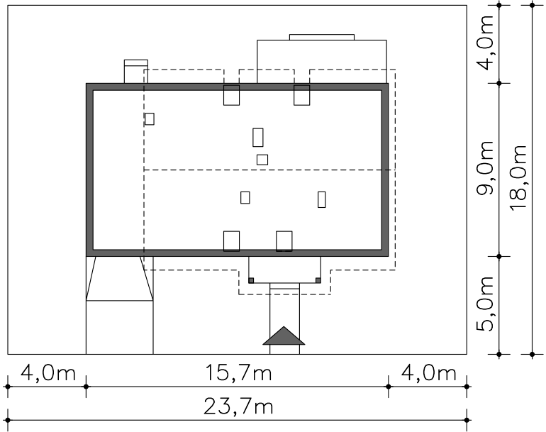 Grafika przedstawia minimalne wymiary działki. Aby sprawdzić, czy dom może być realizowany na konkretnej działce należy uzyskać Wypis i Wyrys z Miejscowego Planu Zagospodarowania Przestrzennego lub jeśli na danym terenie nie ma planu – Decyzję o warunkach zabudowy. Wszystkie projekty wymagają adaptacji do warunków miejscowych przez projektanta lokalnego.
