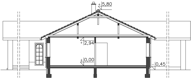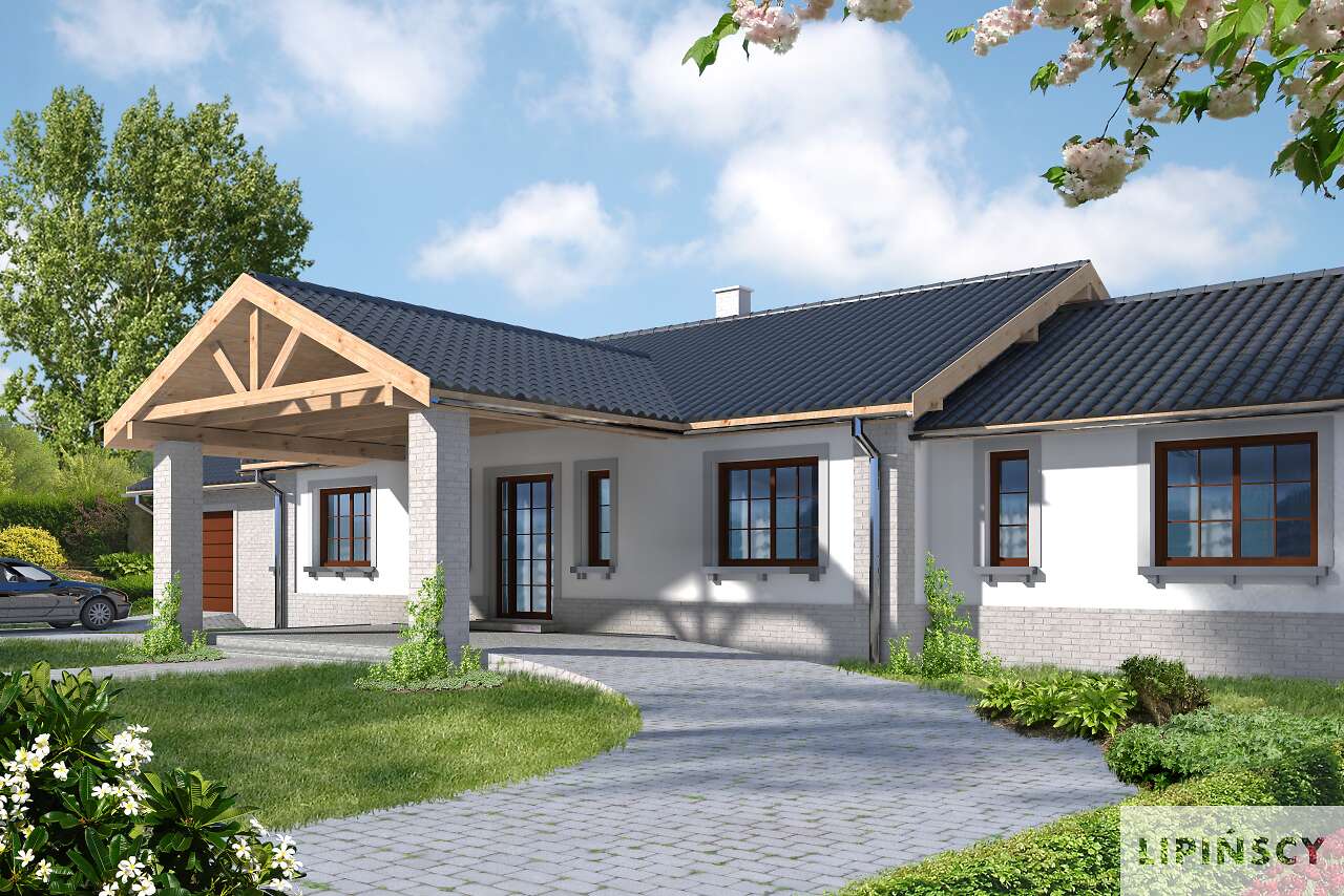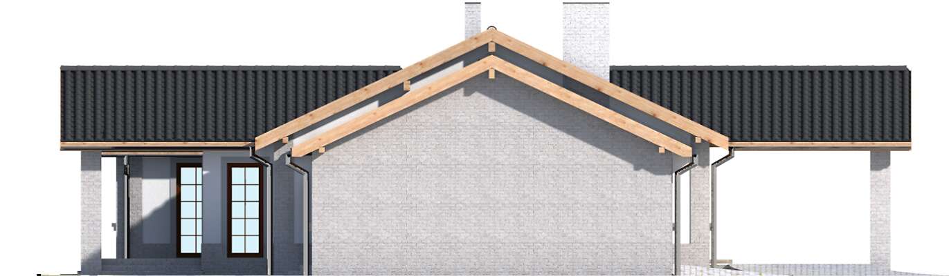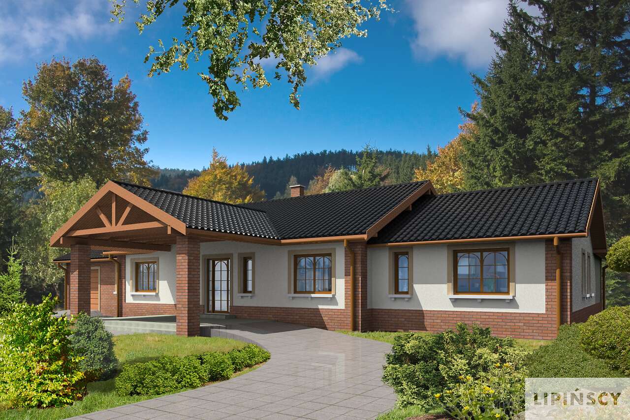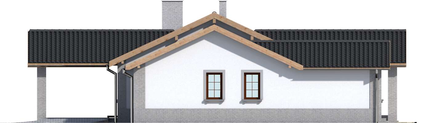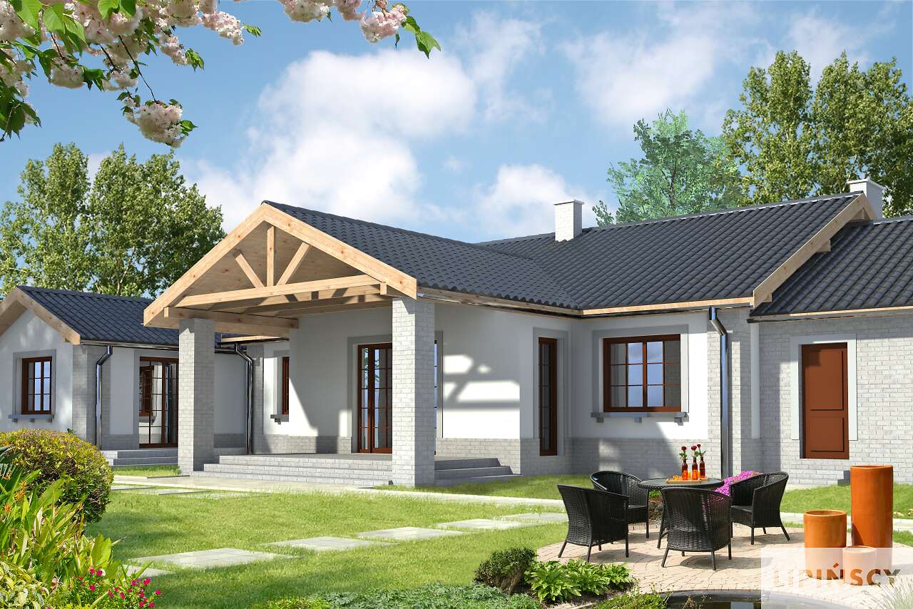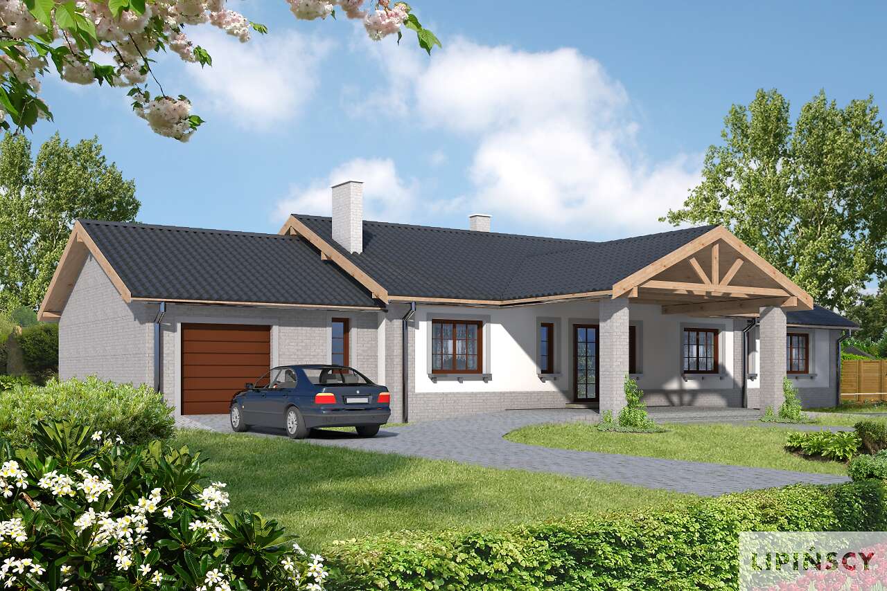 Duży i wygodny dom dla pięcio-sześcioosobowej rodziny, o atrakcyjnej architekturze, zdecydowany detal nadaje temu domowi wyjątkowego charakteru, który może zaspokoić nawet bardziej wysublimowane gusta. Dobrze widoczny jest podział na trzy strefy – dzienną, nocną i gospodarczą. Duży pokój dzienny stanowi centralny punkt domu i posiada bezpośrednie połączenie z jadalnią i kuchnią. Przy kuchni znajdziemy wejście do strefy gospodarczej, w której można zlokalizować np. Spiżarnię i pomieszczenie na sprzęt ogrodniczy. W strefie nocnej, dostępnej z hallu głównego, znajdziemy sypialnię rodziców z własną łazienką i garderobą oraz trzy sypialnie dla dzieci z łazienką i garderobami.