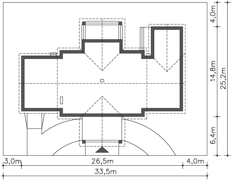 Grafika przedstawia minimalne wymiary działki. Aby sprawdzić, czy dom może być realizowany na konkretnej działce należy uzyskać Wypis i Wyrys z Miejscowego Planu Zagospodarowania Przestrzennego lub jeśli na danym terenie nie ma planu – Decyzję o warunkach zabudowy. Wszystkie projekty wymagają adaptacji do warunków miejscowych przez projektanta lokalnego.