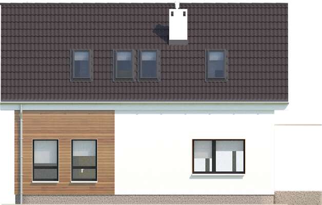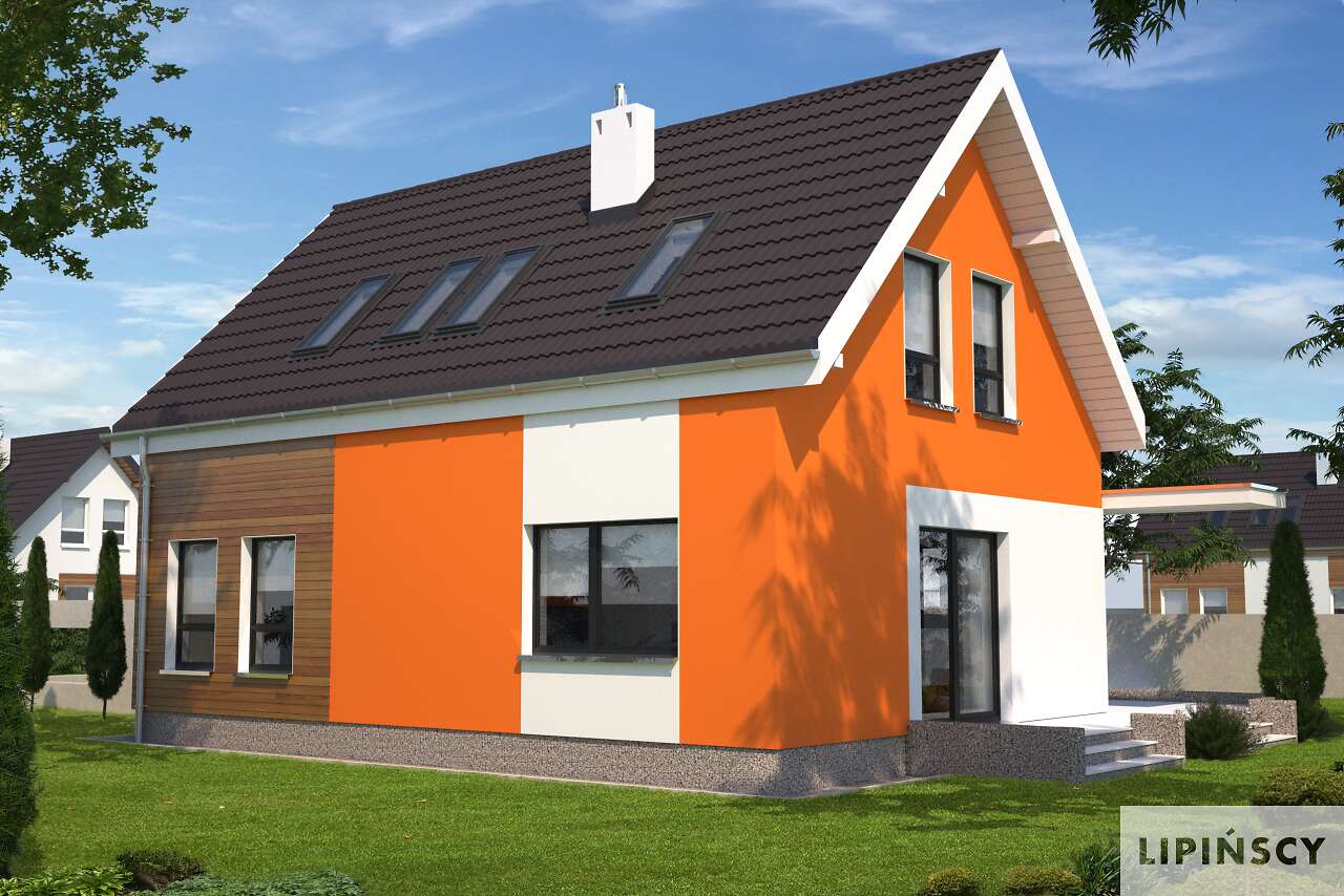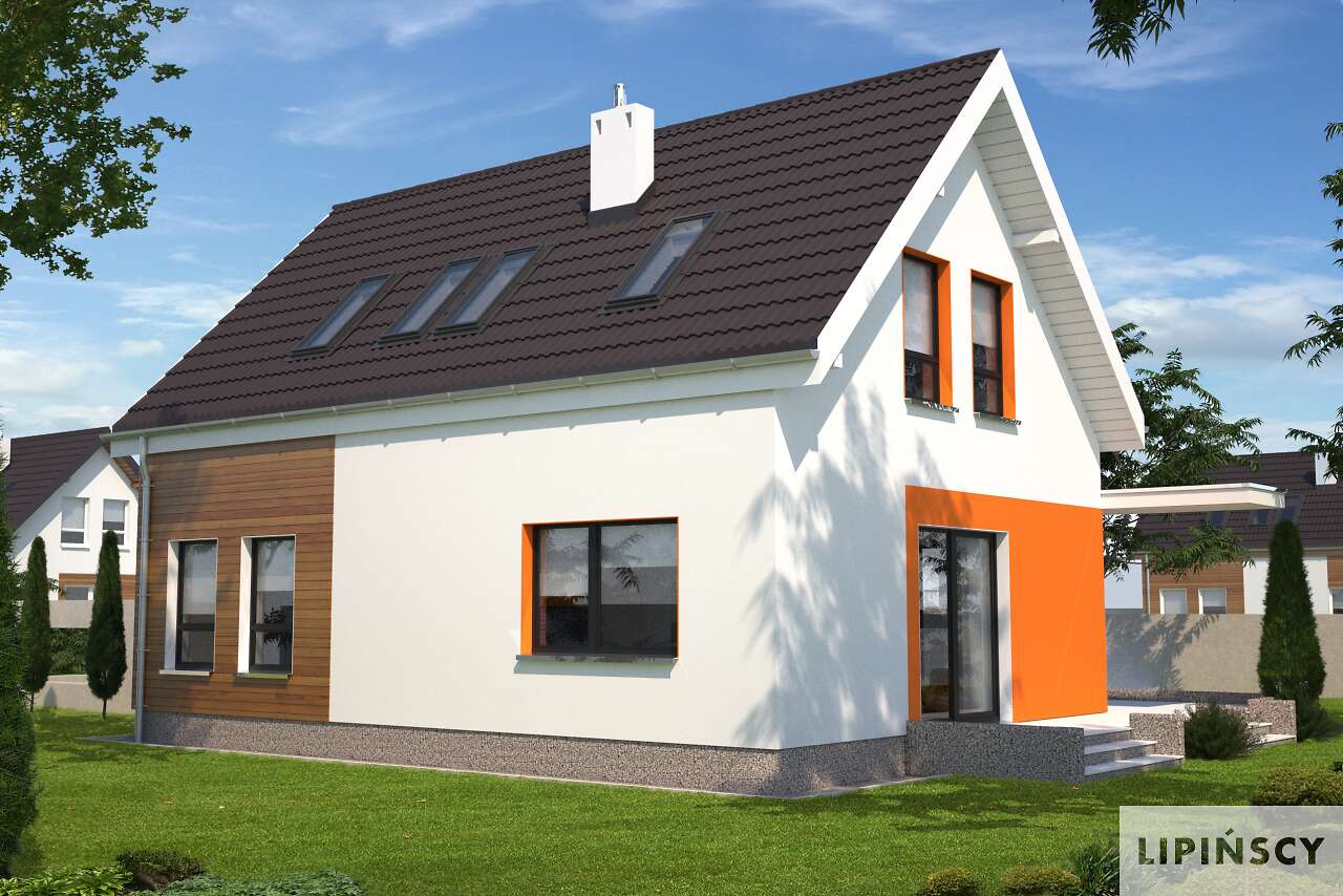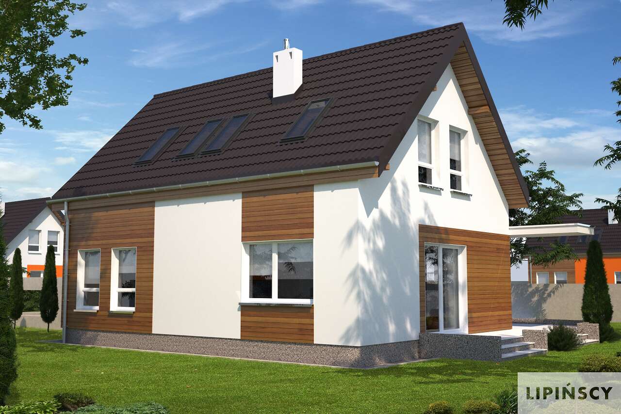 Wygodny, funkcjonalny dom z użytkowym poddaszem, w którym na parterze wydzielono jedną wspólną strefę dzienną, w skład której wchodzi otwarta na salon kuchnia z jadalnią, dodatkowy pokój, łazienka i obszerne pomieszczenie gospodarcze. Poddasze podzielono na trzy ustawne sypialnie, w tym jedna ma własną garderobę i komfortową, dobrze doświetloną łazienkę. Prosta, elegancka bryła domu ma charakterystyczną, prostokątną lukarnę w elewacji frontowej, a mocne akcenty kolorystyczne i drewniane elementy wykończenia nadają budynkowi nowoczesnego rysu.
