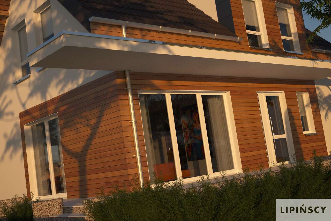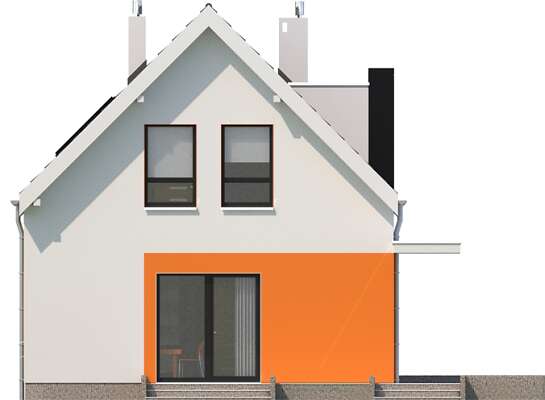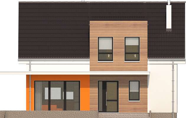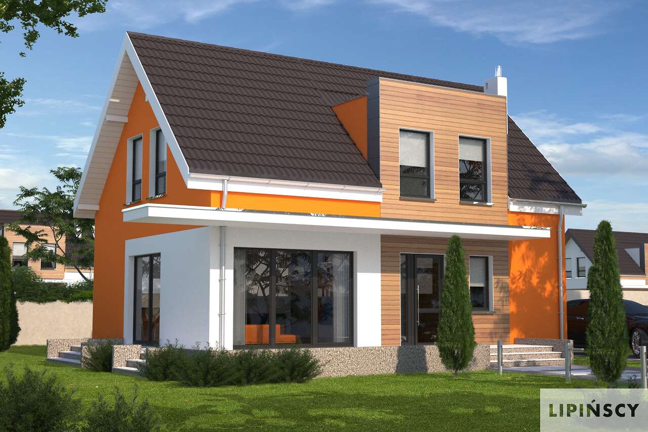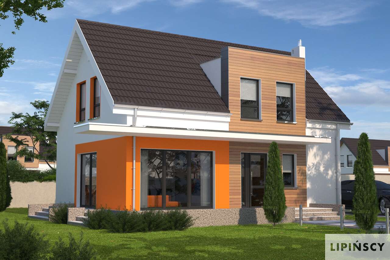 Wygodny, funkcjonalny dom z użytkowym poddaszem, w którym na parterze wydzielono jedną wspólną strefę dzienną, w skład której wchodzi otwarta na salon kuchnia z jadalnią, dodatkowy pokój, łazienka i obszerne pomieszczenie gospodarcze. Poddasze podzielono na trzy ustawne sypialnie, w tym jedna ma własną garderobę i komfortową, dobrze doświetloną łazienkę. Prosta, elegancka bryła domu ma charakterystyczną, prostokątną lukarnę w elewacji frontowej, a mocne akcenty kolorystyczne i drewniane elementy wykończenia nadają budynkowi nowoczesnego rysu.