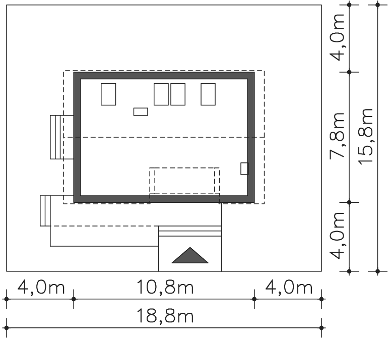 Grafika przedstawia minimalne wymiary działki. Aby sprawdzić, czy dom może być realizowany na konkretnej działce należy uzyskać Wypis i Wyrys z Miejscowego Planu Zagospodarowania Przestrzennego lub jeśli na danym terenie nie ma planu – Decyzję o warunkach zabudowy. Wszystkie projekty wymagają adaptacji do warunków miejscowych przez projektanta lokalnego.