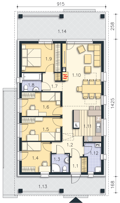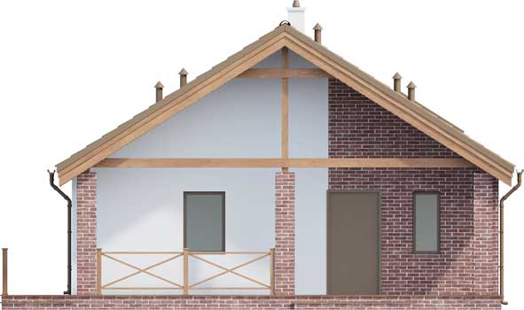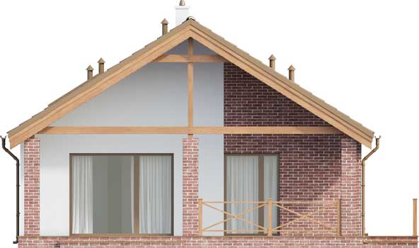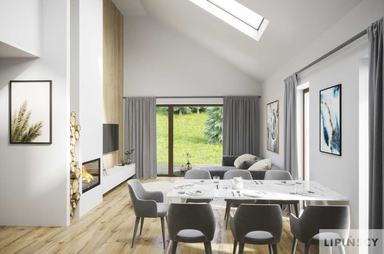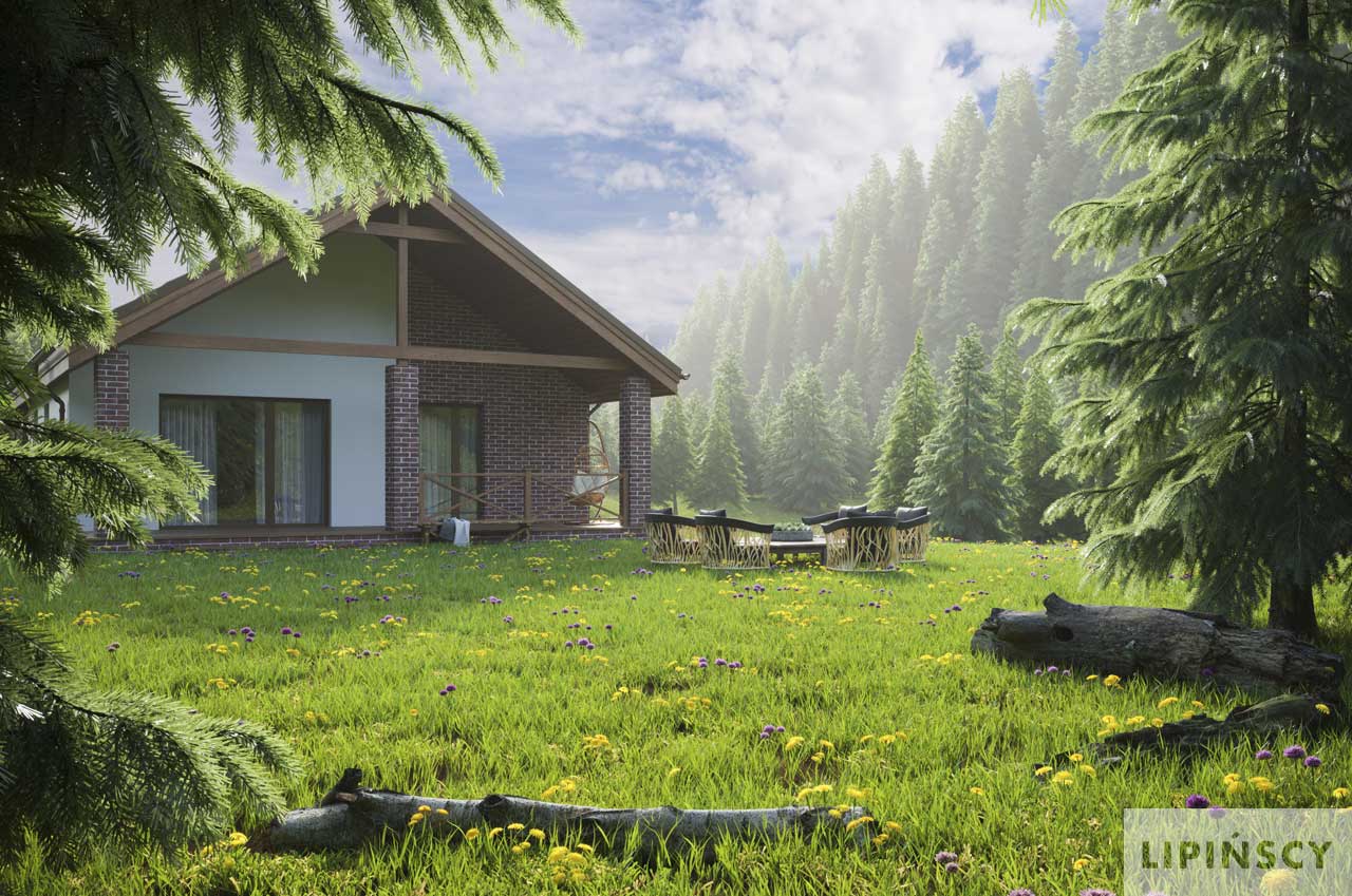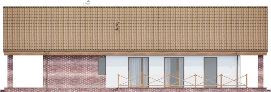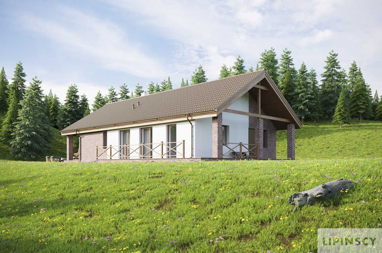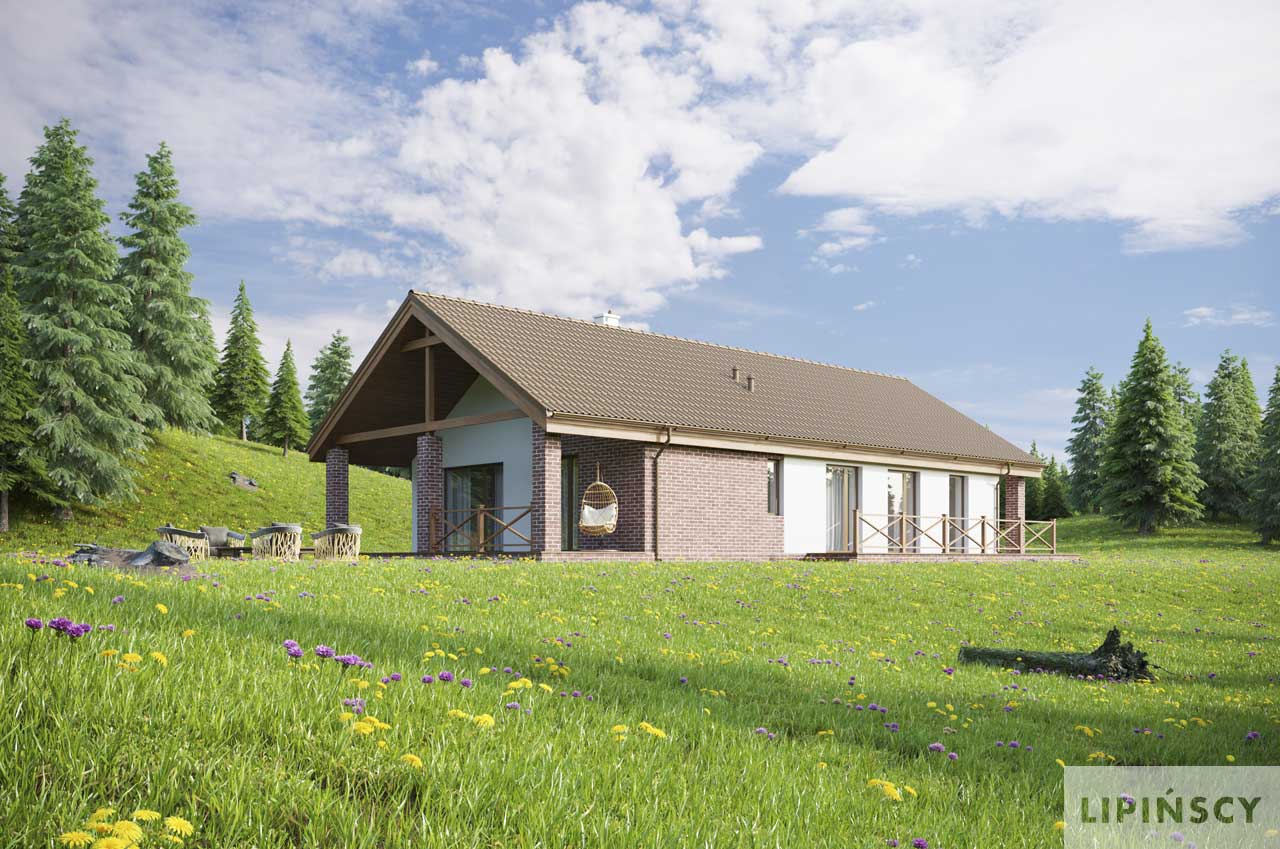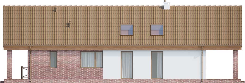 Projekt małego, pojemnego domu o prostej formie i elewacji ze stylem. Wnętrze rozplanowano w przejrzysty sposób, tak, aby użytkowanie było zupełnie intuicyjne i wygodne. Na 100 m kw. umieszczono 4 sypialnie i wyjątkowo efektowną strefę dzienną. Wiatrołap prowadzi do wnętrza, półotwarta kuchnia z kontuarem, wysoki salon z jadalnią, atrakcyjnie doświetlany dodatkowo oknami połaciowymi, kominek daje ciepło w jesienne wieczory, a zadaszony taras zapewnia przyjemny cień letnią porą. Pokój rodziców ma wyjście na zadaszony taras i własną łazienkę, zapewnia wygodę i intymność. Trzy pokoje dzieciaków mają własną łazienkę i wyjścia na boczny taras. Jest to dom w sam raz dla rodziny ceniącej sobie komfort i estetykę.