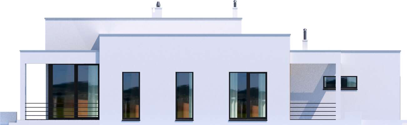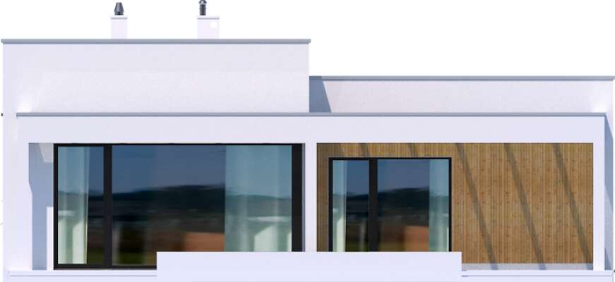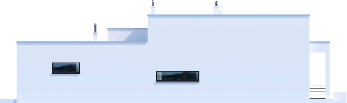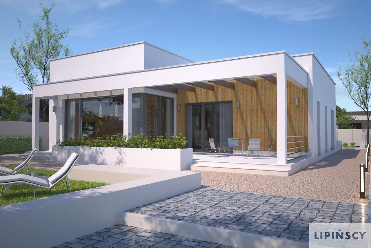 Rozłożysty parterowy dom z płaskim dachem dla nowoczesnej 2-3 osobowej rodziny, która ceni sobie duże, otwarte przestrzenie i komfortową strefę prywatną. Ten dom nastawiony jest na oferowanie wygody w użytkowaniu – widać to zarówno w części dziennej, gdzie kuchnia, jadalnia i salon łączą się we wspólną przestrzeń, a jednocześnie kuchnia jest ukryta optycznie za kominkiem, który tworzy serce domu. Sypialnia małżeńska jest duża i wyposażona w bardzo pojemną garderobę, obok znajduje się łazienka, a drugi pokój nadaje się dla dziecka, lub też jako pokój do pracy. Z dwustanowiskowego garażu można wygodnie przejść do domu przez spiżarnię, gdzie można zostawić zakupy. Uzupełnieniem domu jest rozległy taras z pergolą, na który jest wejście zarówno z mocno przeszklonego salonu, jak i z sypialni. Zatem najważniejsze pomieszczenia w domu są dostępne bezpośrednio z tarasu, co sprawia, że zanika bariera pomiędzy życiem w domu i w ogrodzie. W projekcie przewidziano ogrzewanie kotłem na gaz. Możliwa jest zmiana ogrzewania na pompę ciepła.