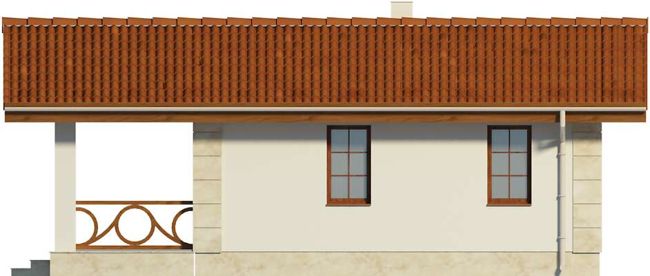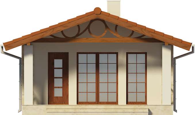Niewielki dom weekendowy, doskonały do rekreacyjnego spędzania czasu. Do dyspozycji użytkowników domku jest salon z kominkiem i aneksem kuchennym, łazienka i sypialnia. Zadaszone wejście, stanowiące także taras to miejsce, gdzie zmieści się duży stół. Duże przeszklenia od strony frontowej doskonale doświetlają wnętrze. Prosta architektura i konstrukcja powodują, że jest to dom niedrogi w wykonaniu.