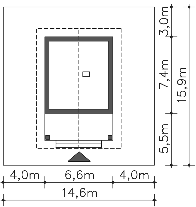 Grafika przedstawia minimalne wymiary działki. Aby sprawdzić, czy dom może być realizowany na konkretnej działce należy uzyskać Wypis i Wyrys z Miejscowego Planu Zagospodarowania Przestrzennego lub jeśli na danym terenie nie ma planu – Decyzję o warunkach zabudowy. Wszystkie projekty wymagają adaptacji do warunków miejscowych przez projektanta lokalnego.