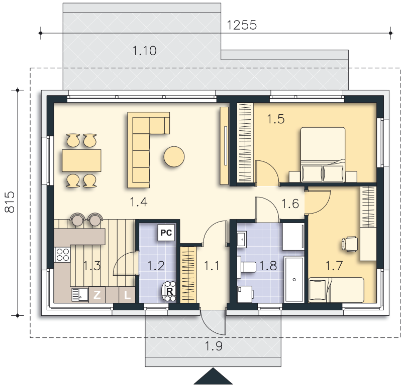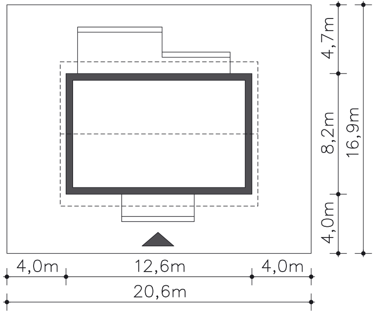 Grafika przedstawia minimalne wymiary działki. Aby sprawdzić, czy dom może być realizowany na konkretnej działce należy uzyskać Wypis i Wyrys z Miejscowego Planu Zagospodarowania Przestrzennego lub jeśli na danym terenie nie ma planu – Decyzję o warunkach zabudowy. Wszystkie projekty wymagają adaptacji do warunków miejscowych przez projektanta lokalnego.