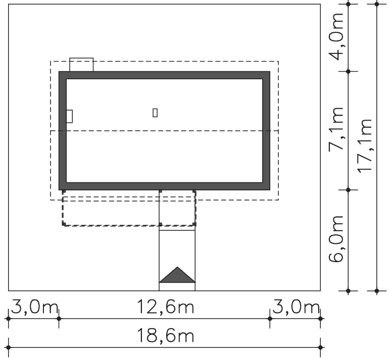 Grafika przedstawia minimalne wymiary działki. Aby sprawdzić, czy dom może być realizowany na konkretnej działce należy uzyskać Wypis i Wyrys z Miejscowego Planu Zagospodarowania Przestrzennego lub jeśli na danym terenie nie ma planu – Decyzję o warunkach zabudowy. Wszystkie projekty wymagają adaptacji do warunków miejscowych przez projektanta lokalnego.