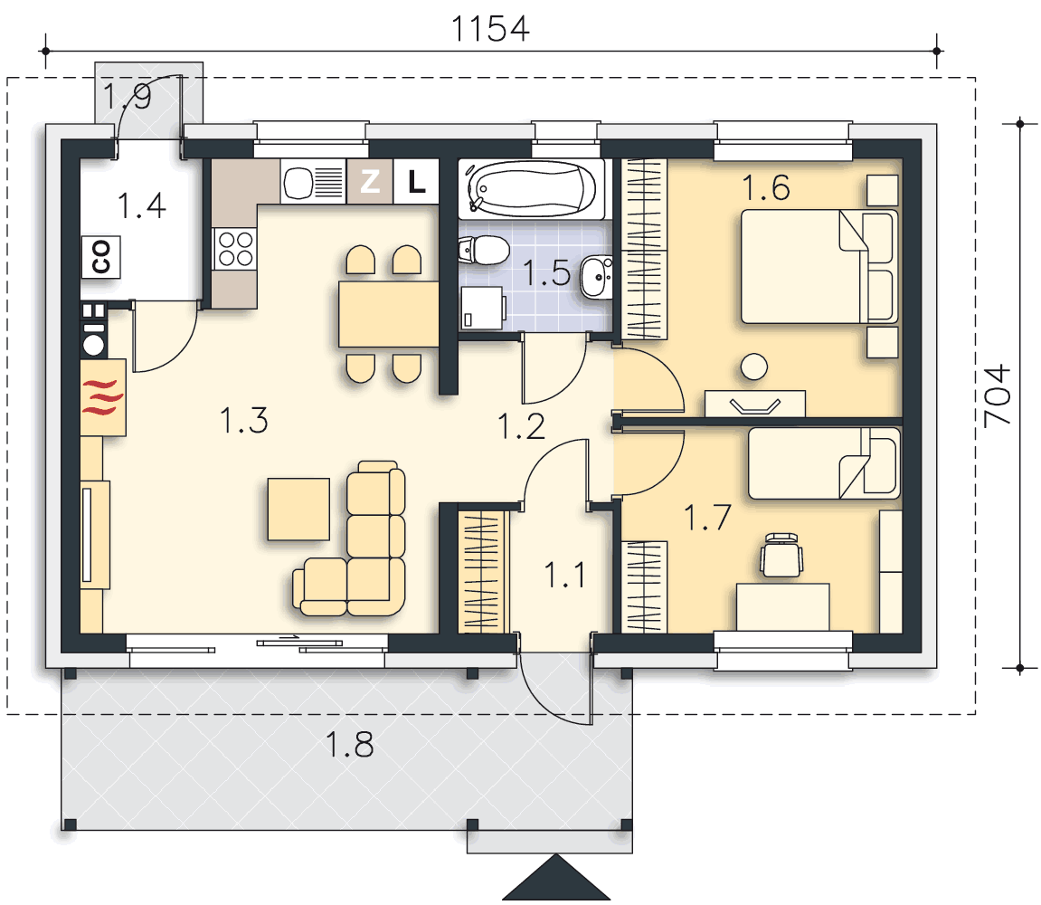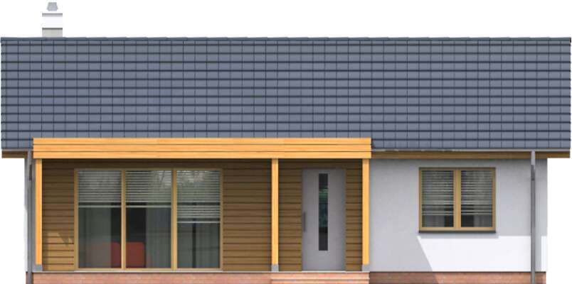Niewielki dom parterowy, którego zwarta bryła i prosta konstrukcja korzystnie wpływają zarówno na koszty budowy, jak i koszty eksploatacyjne. Dom zaprojektowany został z przeznaczeniem dla niewielkiej rodziny (rodzice z dzieckiem, para seniorów). Dzięki zlokalizowaniu dobrze doświetlonego salonu od frontu, dom można z powodzeniem wybudować na niezbyt szerokiej działce z południową orientacją. Wygodę mieszkania zapewniają użytkownikom dwie ustawne sypialnie oraz duża łazienka. Salon, graniczący z otwartą kuchnią jest sercem domu.