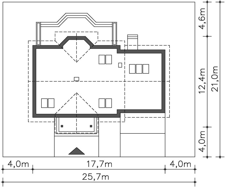 Grafika przedstawia minimalne wymiary działki. Aby sprawdzić, czy dom może być realizowany na konkretnej działce należy uzyskać Wypis i Wyrys z Miejscowego Planu Zagospodarowania Przestrzennego lub jeśli na danym terenie nie ma planu – Decyzję o warunkach zabudowy. Wszystkie projekty wymagają adaptacji do warunków miejscowych przez projektanta lokalnego.