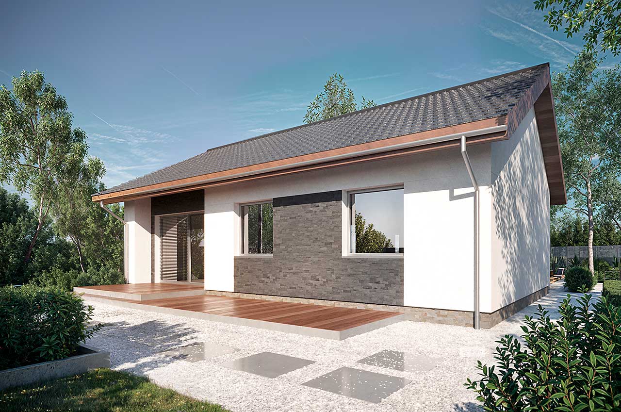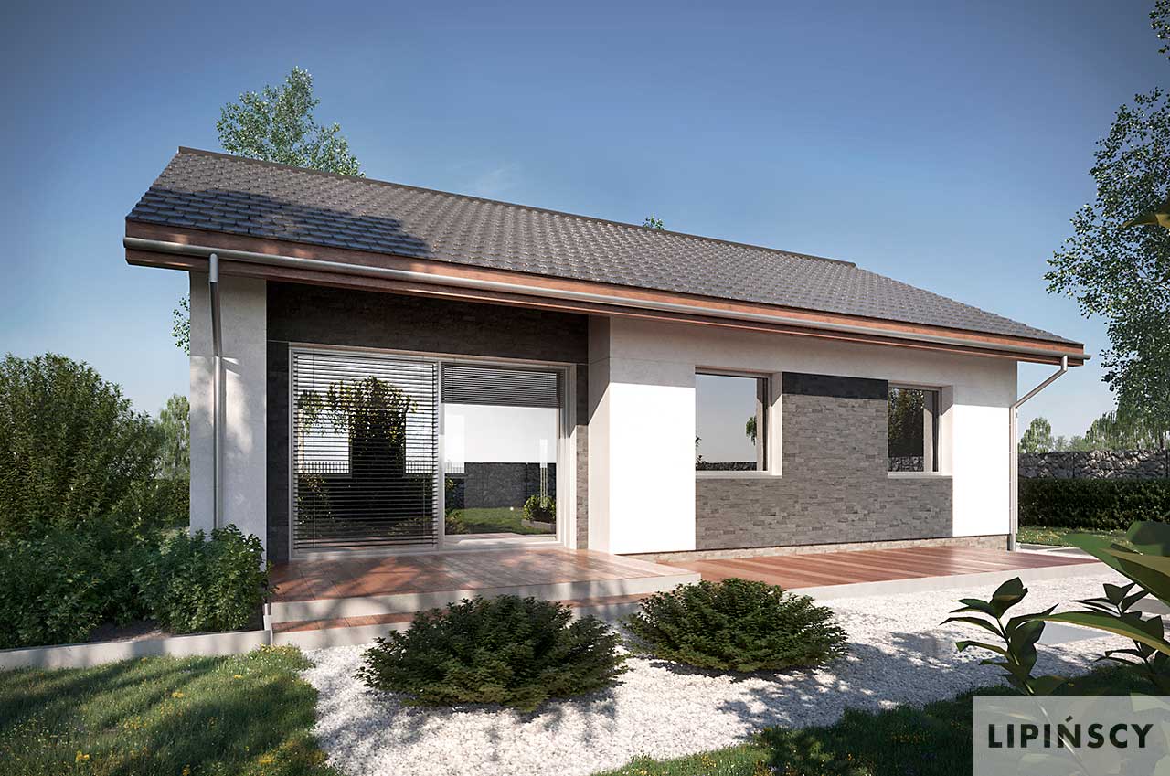 Jena to projekt domu parterowego, energooszczędnego o prostej bryle z dwuspadowym dachem i z wygodnym wnętrzem. Otwarta strefa dzienna jest idealną przestrzenią do spędzania wspólnie czasu z rodziną i znajomymi. Uzupełnia ją zadaszony taras, który jest przedłużeniem salonu i dzięki dużemu przeszkleniu łączy go z ogrodem. Dwie sypialnie, łazienka i garderoba, w której umieszczono energooszczędne instalacje: pompę ciepła i rekuperator, zostały zlokalizowane w strefie prywatnej. Jena to z założenia dom tani w budowie, a poprzez zwartą bryłę i rozwiązania oszczędzające energię, jest również niedrogi w eksploatacji.