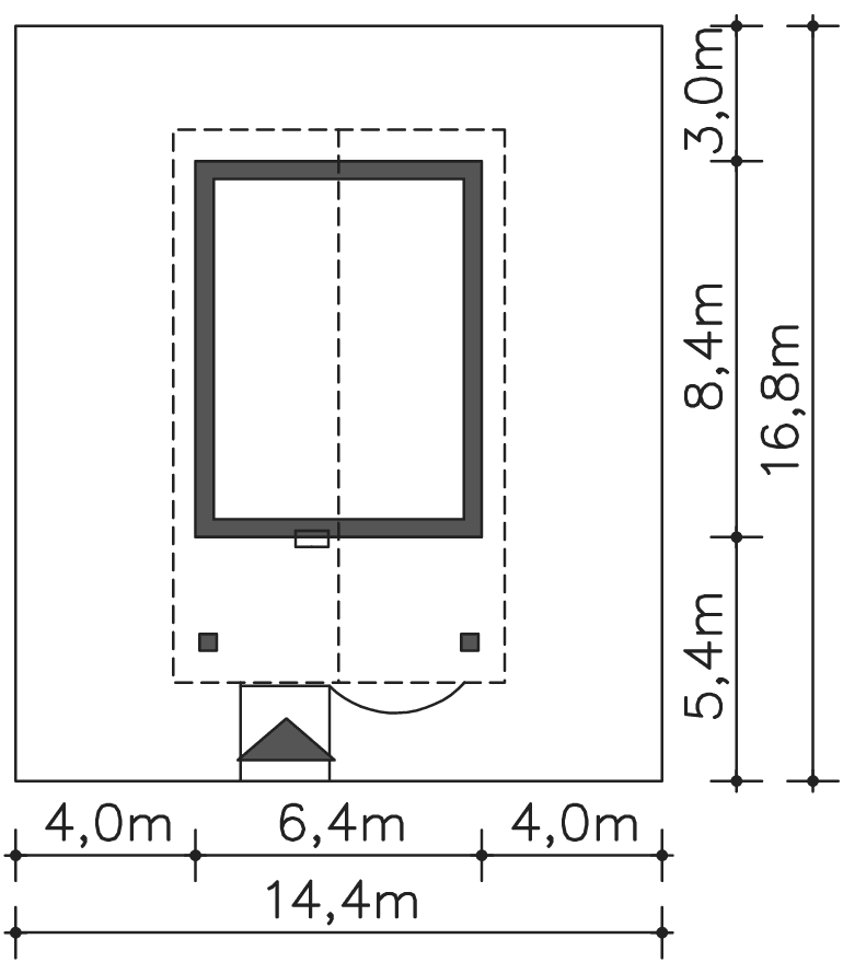 Grafika przedstawia minimalne wymiary działki. Aby sprawdzić, czy dom może być realizowany na konkretnej działce należy uzyskać Wypis i Wyrys z Miejscowego Planu Zagospodarowania Przestrzennego lub jeśli na danym terenie nie ma planu – Decyzję o warunkach zabudowy. Wszystkie projekty wymagają adaptacji do warunków miejscowych przez projektanta lokalnego.