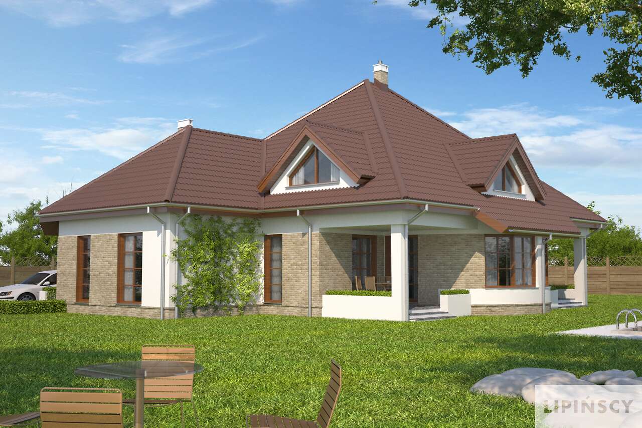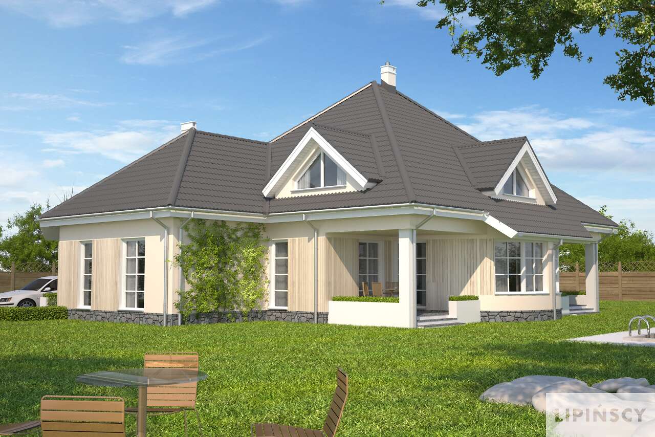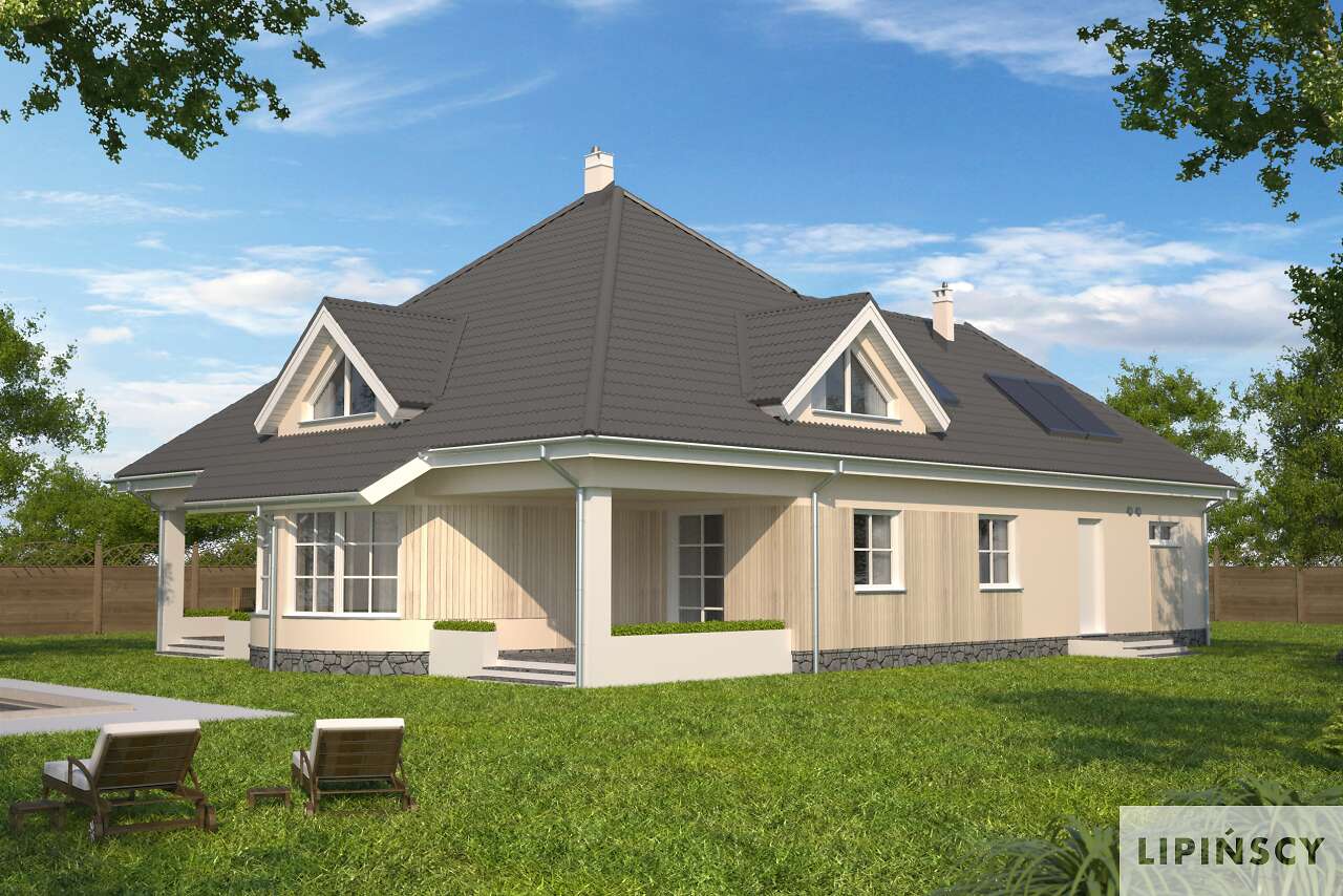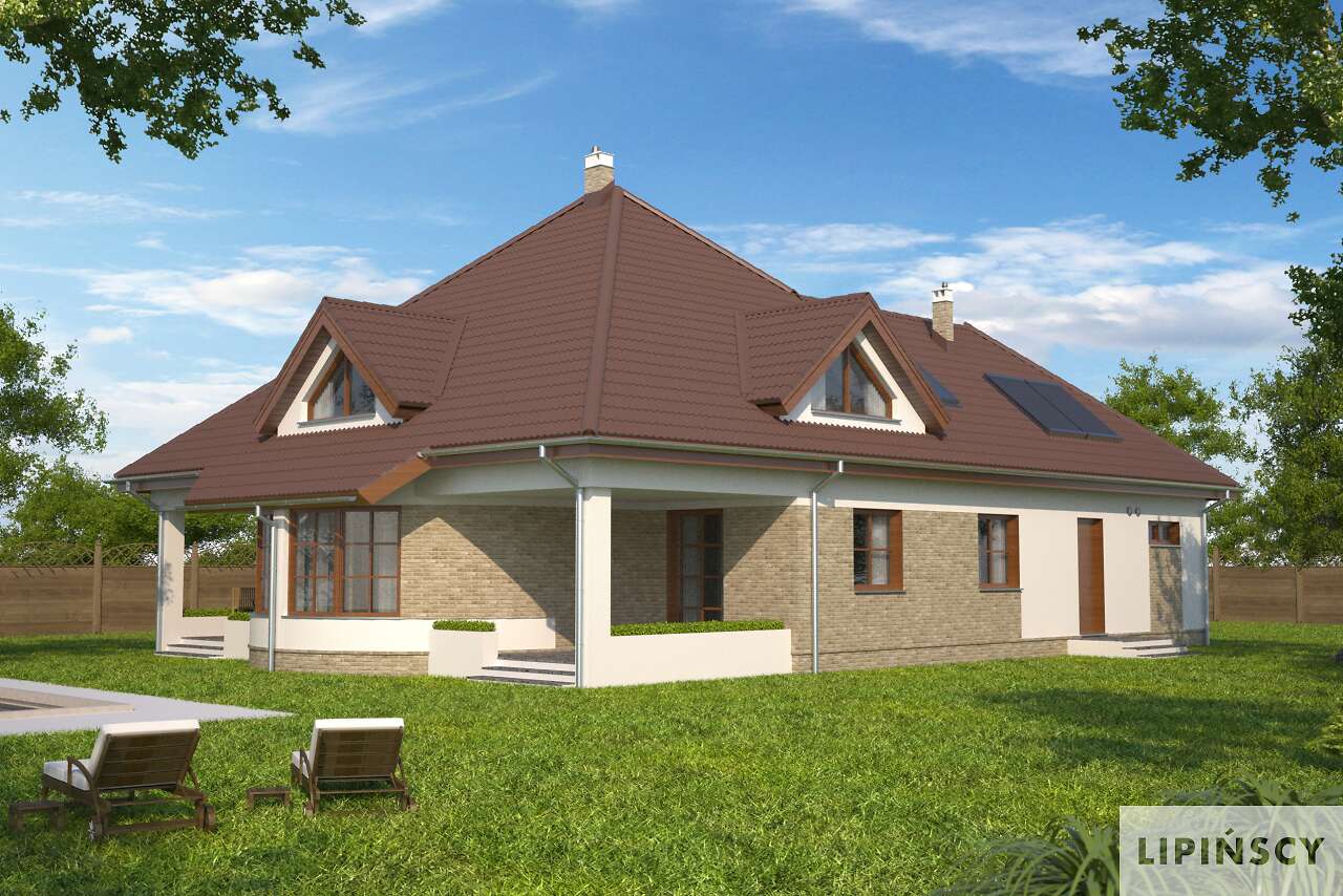 Dom z gabinetem z osobnym wejściem (np. lekarskim). Duży dom energooszczędny, który charakteryzuje się przestronnym salonem z łukową ścianą i wyjściem na dwa zadaszone tarasy. Wszystkie plusy tego domu można wymieniać bez końca – duża kuchnia z umieszczoną na wyspie kuchenką, osobna jadalnia, pokój gościnny, gabinet z osobnym wejściem, sauna, siłownia, osobna pralnia, bezpośrednie przejście do domu z garażu, praktyczna spiżarnia. To wszystko zawarte jest w pięknej bryle z wielospadowym dachem.