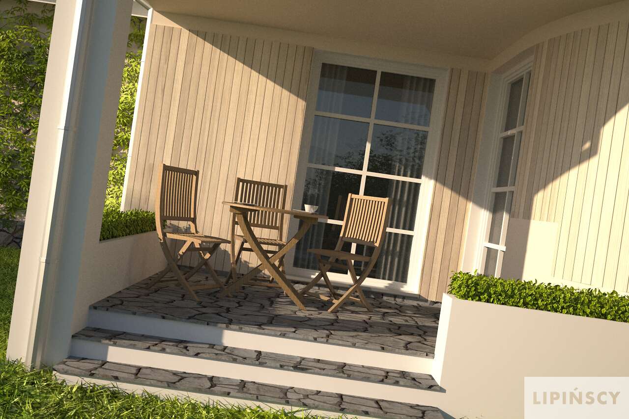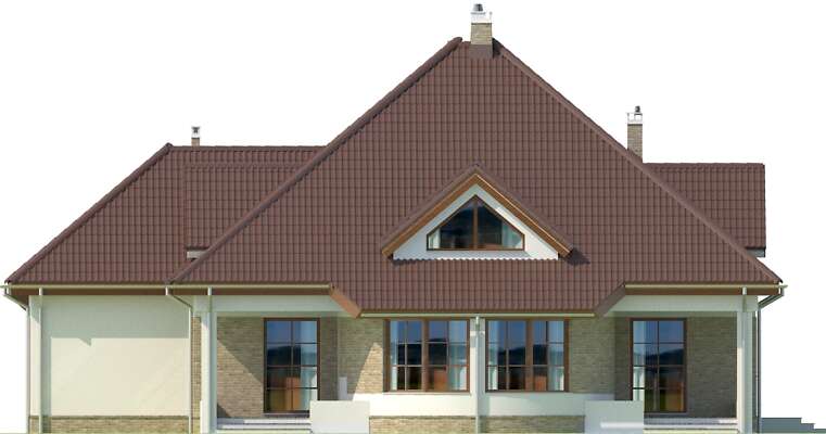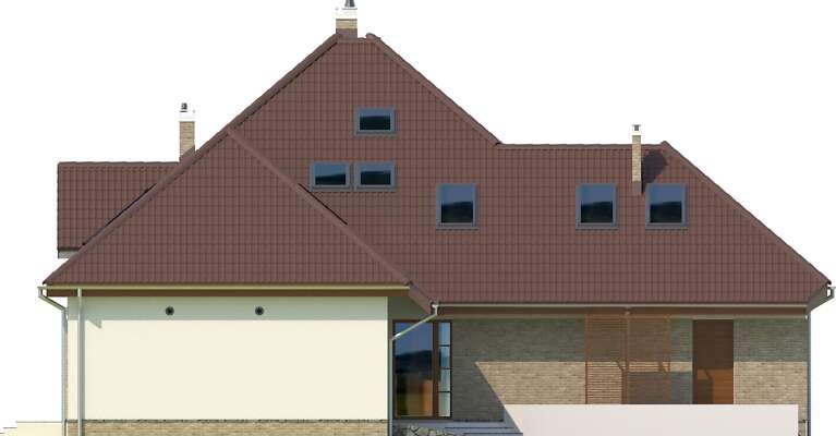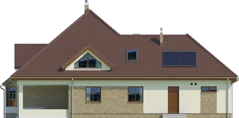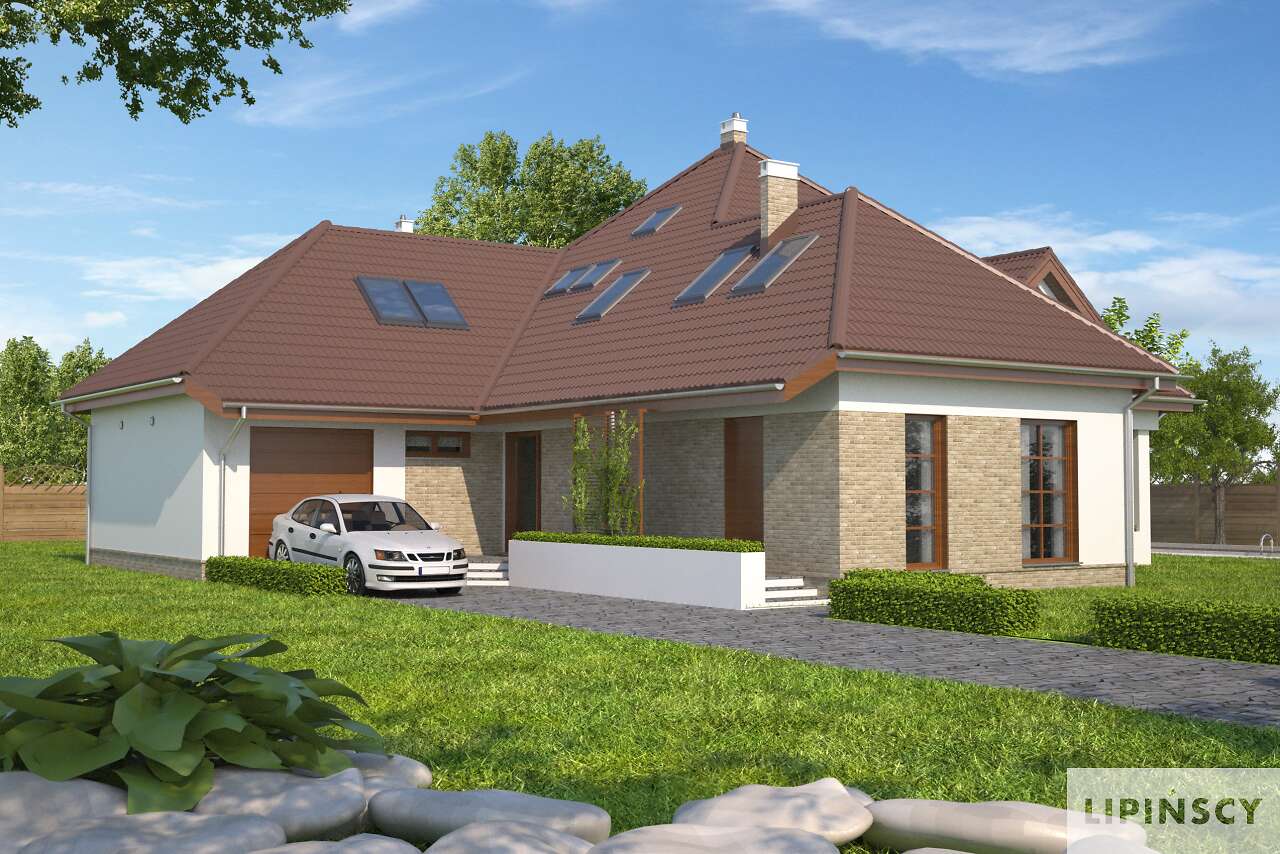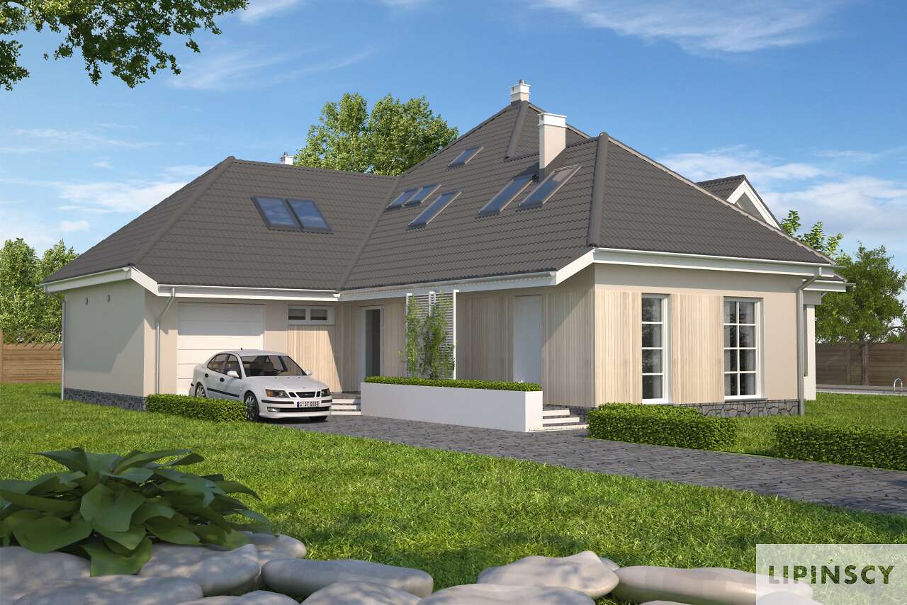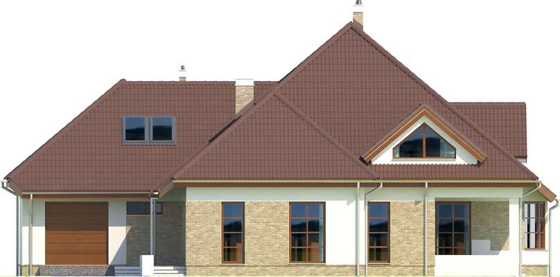 Dom z gabinetem z osobnym wejściem (np. lekarskim). Duży dom energooszczędny, który charakteryzuje się przestronnym salonem z łukową ścianą i wyjściem na dwa zadaszone tarasy. Wszystkie plusy tego domu można wymieniać bez końca – duża kuchnia z umieszczoną na wyspie kuchenką, osobna jadalnia, pokój gościnny, gabinet z osobnym wejściem, sauna, siłownia, osobna pralnia, bezpośrednie przejście do domu z garażu, praktyczna spiżarnia. To wszystko zawarte jest w pięknej bryle z wielospadowym dachem.