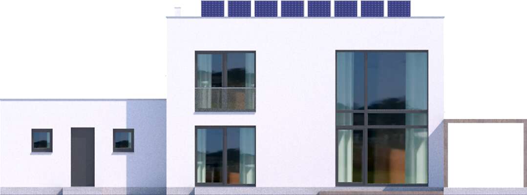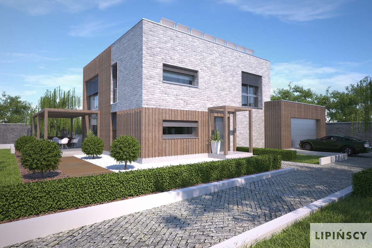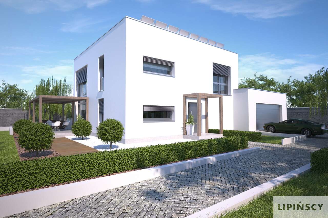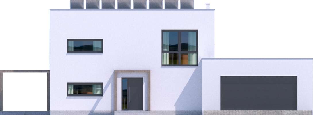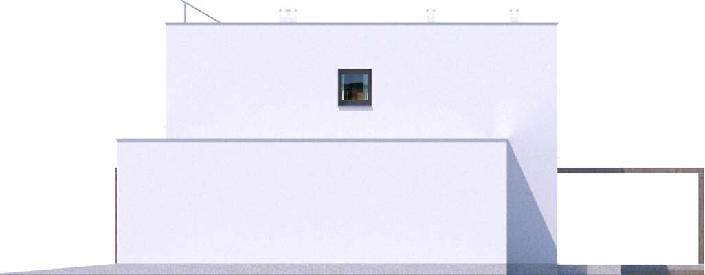 Nowoczesny, energooszczędny dom z płaskim dachem, o zwartej, zaplanowanej na bazie kwadratu bryle. Taki układ gwarantuje funkcjonalne rozplanowanie przestrzeni i wygodę, również osobom niepełnosprawnym. Większą część parteru zajmuje przestronny, jasny salon, którego ozdobą jest antresola oraz centralnie umiejscowione schody. Uwagę zwraca również otwarta kuchnia, odgraniczona od salonu praktyczną wyspą stołową. Na parterze przewidziano także dodatkowy pokój, schowek, łazienkę oraz pralnię, przez którą można przejść do garażu na dwa auta. Druga kondygnacja to strefa prywatna z trzema ustawnymi pokojami oraz dużą, wygodną łazienką.