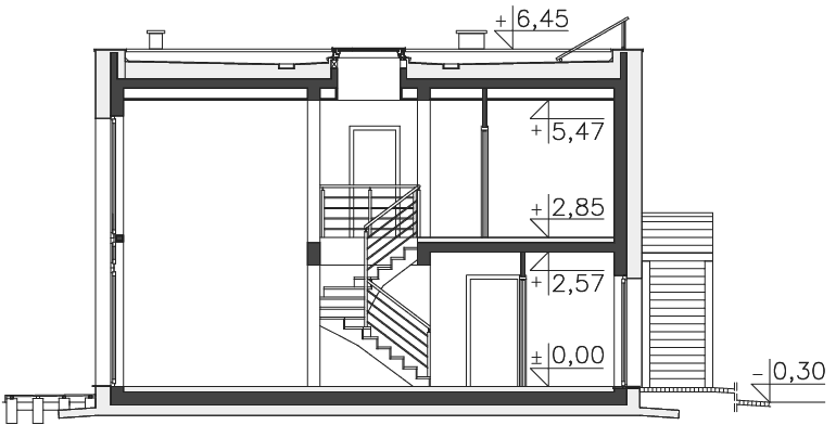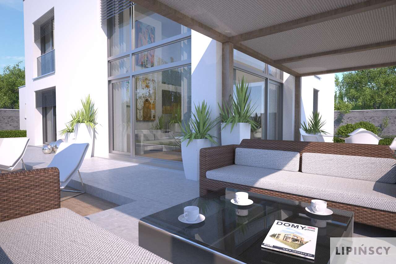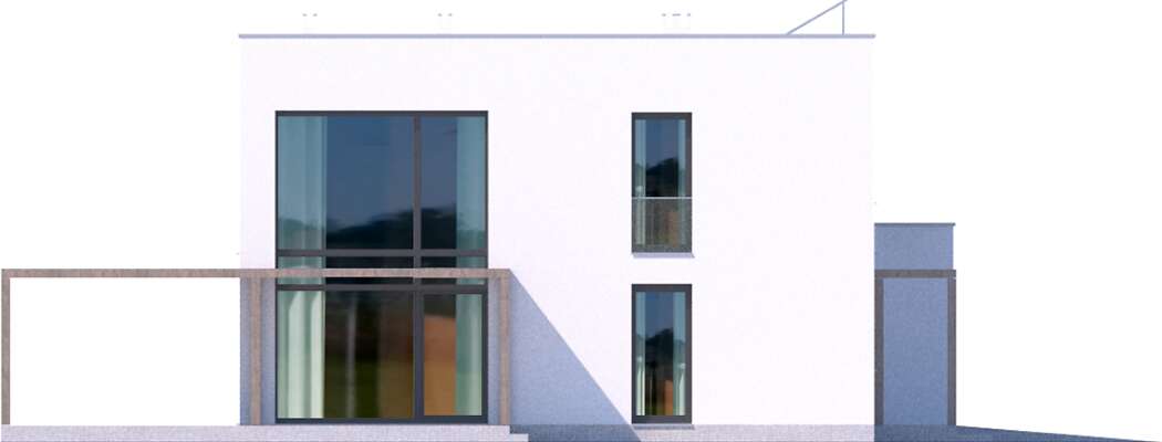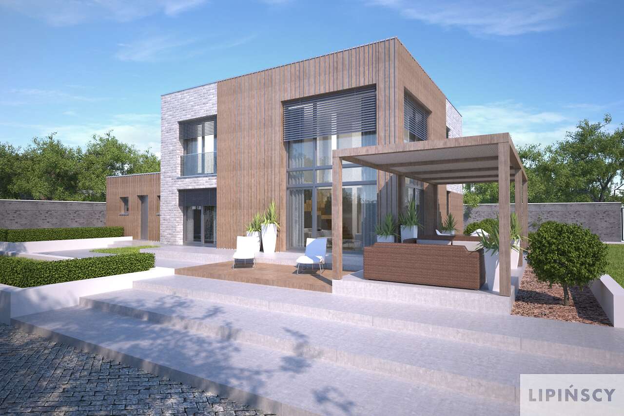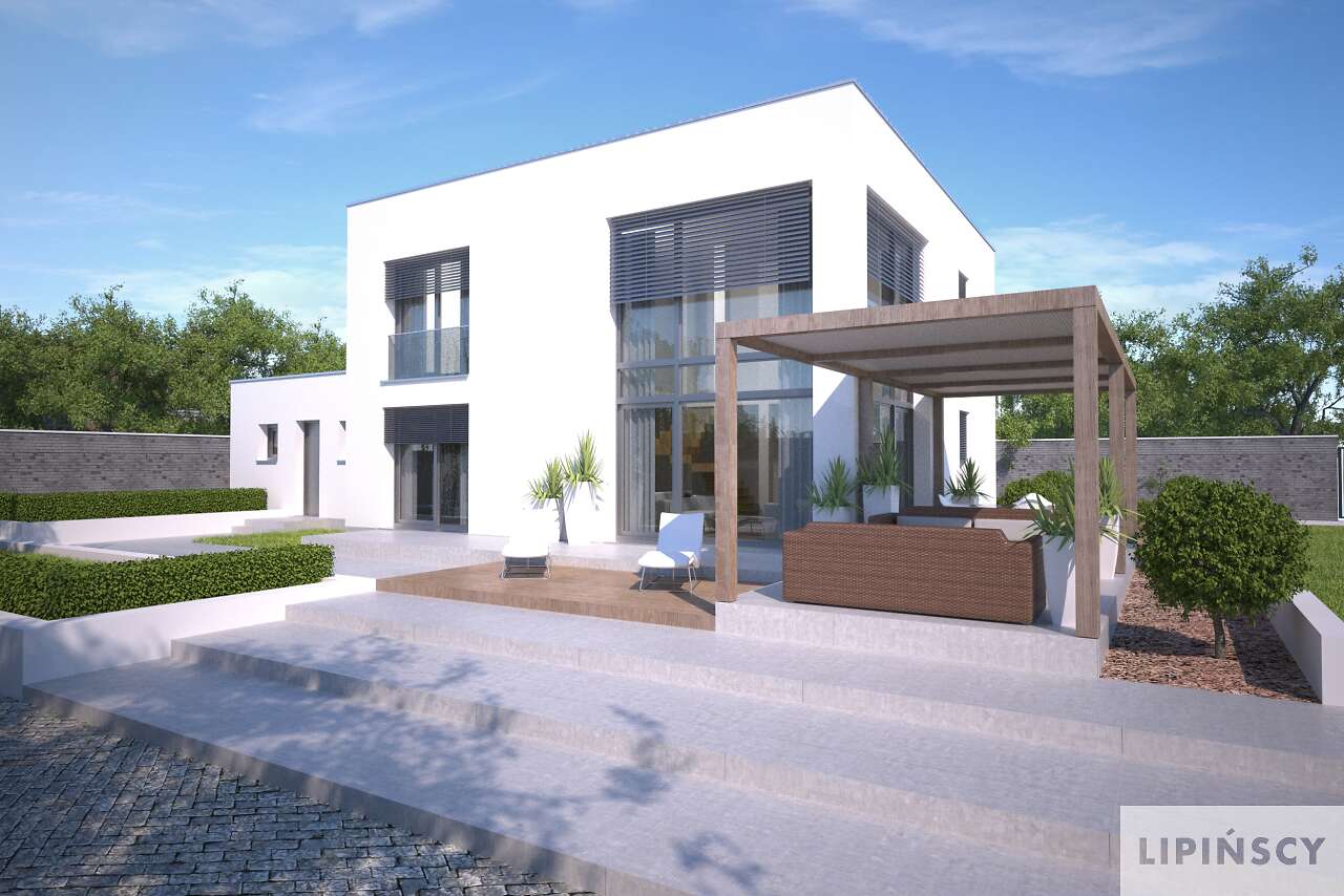 Nowoczesny, energooszczędny dom z płaskim dachem, o zwartej, zaplanowanej na bazie kwadratu bryle. Taki układ gwarantuje funkcjonalne rozplanowanie przestrzeni i wygodę, również osobom niepełnosprawnym. Większą część parteru zajmuje przestronny, jasny salon, którego ozdobą jest antresola oraz centralnie umiejscowione schody. Uwagę zwraca również otwarta kuchnia, odgraniczona od salonu praktyczną wyspą stołową. Na parterze przewidziano także dodatkowy pokój, schowek, łazienkę oraz pralnię, przez którą można przejść do garażu na dwa auta. Druga kondygnacja to strefa prywatna z trzema ustawnymi pokojami oraz dużą, wygodną łazienką.