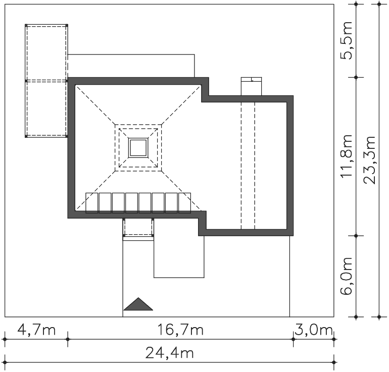 Grafika przedstawia minimalne wymiary działki. Aby sprawdzić, czy dom może być realizowany na konkretnej działce należy uzyskać Wypis i Wyrys z Miejscowego Planu Zagospodarowania Przestrzennego lub jeśli na danym terenie nie ma planu – Decyzję o warunkach zabudowy. Wszystkie projekty wymagają adaptacji do warunków miejscowych przez projektanta lokalnego.