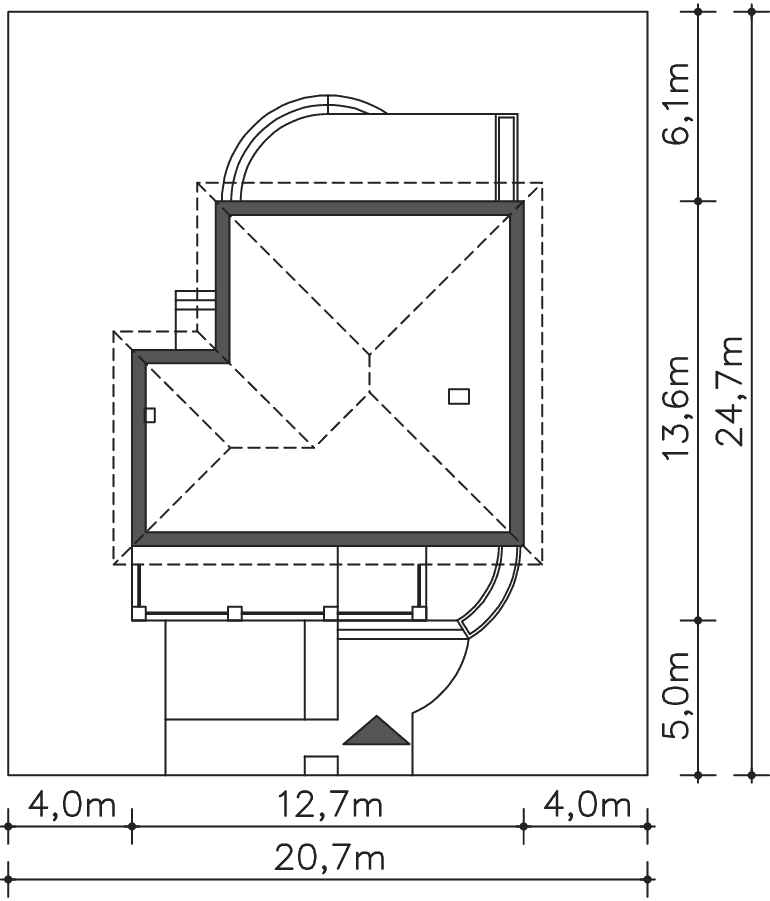 Grafika przedstawia minimalne wymiary działki. Aby sprawdzić, czy dom może być realizowany na konkretnej działce należy uzyskać Wypis i Wyrys z Miejscowego Planu Zagospodarowania Przestrzennego lub jeśli na danym terenie nie ma planu – Decyzję o warunkach zabudowy. Wszystkie projekty wymagają adaptacji do warunków miejscowych przez projektanta lokalnego.