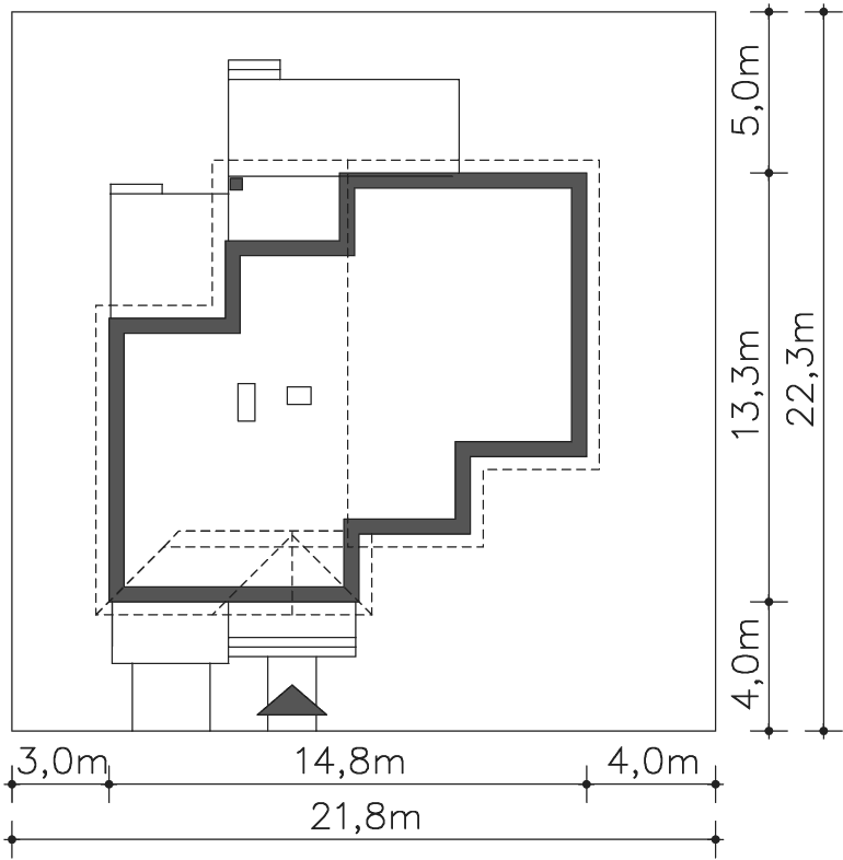 Grafika przedstawia minimalne wymiary działki. Aby sprawdzić, czy dom może być realizowany na konkretnej działce należy uzyskać Wypis i Wyrys z Miejscowego Planu Zagospodarowania Przestrzennego lub jeśli na danym terenie nie ma planu – Decyzję o warunkach zabudowy. Wszystkie projekty wymagają adaptacji do warunków miejscowych przez projektanta lokalnego.