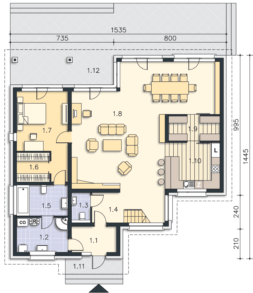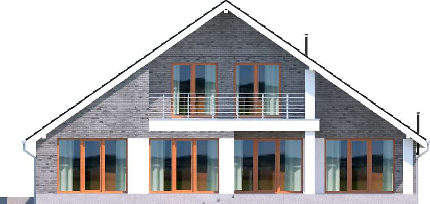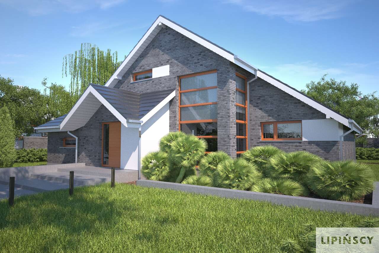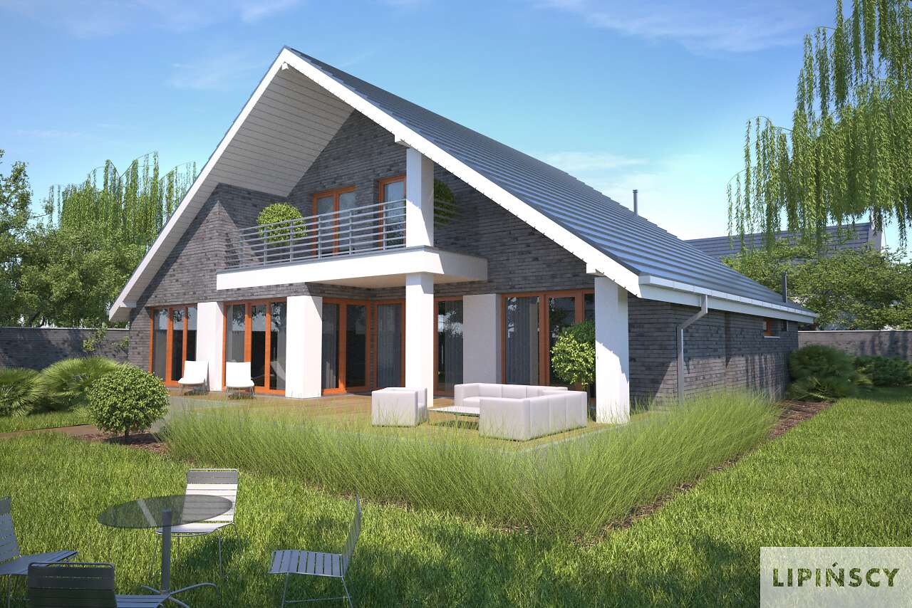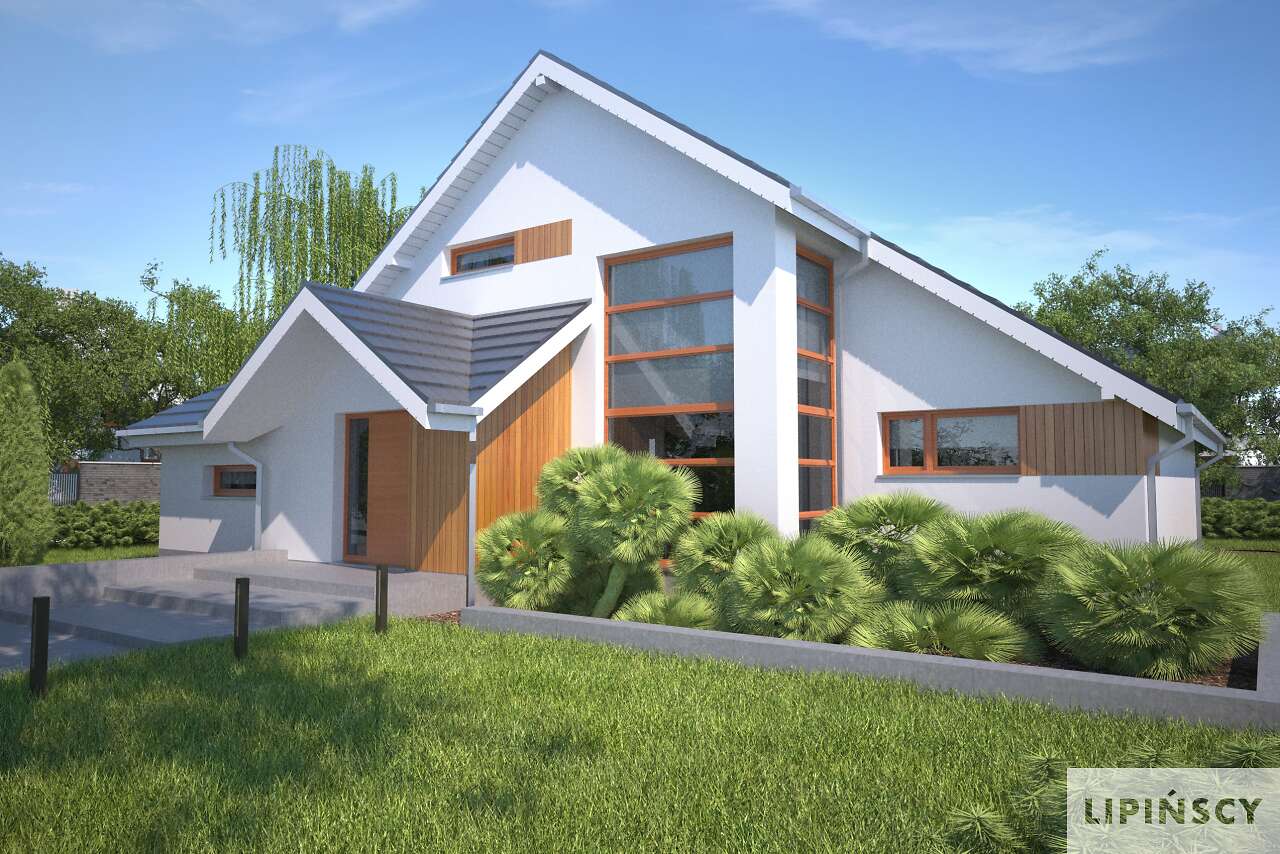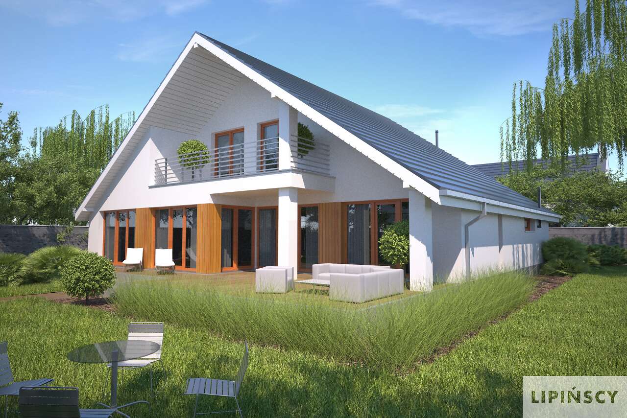 Piękny, wygodny dom z użytkowym poddaszem, zaprojektowany w standardzie energooszczędnym. Jego niewątpliwe atuty to ogromny, jasny salon z jadalnią. Do dyspozycji mieszkańców jest również ustawna kuchnia, obok której zlokalizowano spiżarnię. Charakterystyczną cechą tego projektu jest również wyodrębnienie apartamentu z dużą sypialnią, garderobą i komfortową łazienką na parterze. Poddasze zaplanowano jako wyodrębnioną strefę prywatną, z dwiema sypialniami, garderobą i wygodną łazienką. Ozdobą domu jest duży, częściowo zadaszony taras, usytuowany od strony ogrodowej, z wyjściem z salonu, jadalni i sypialni – doskonały do spędzania czasu na świeżym powietrzu.