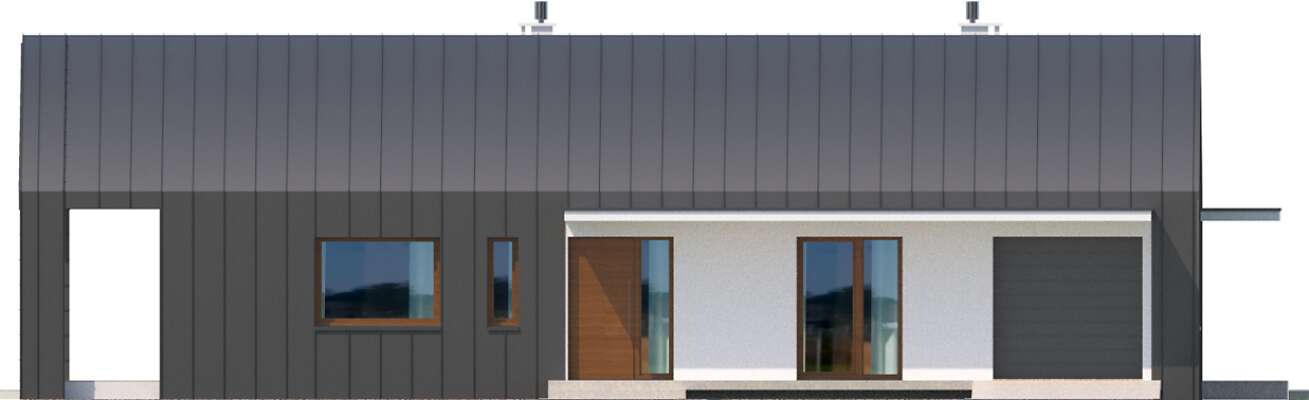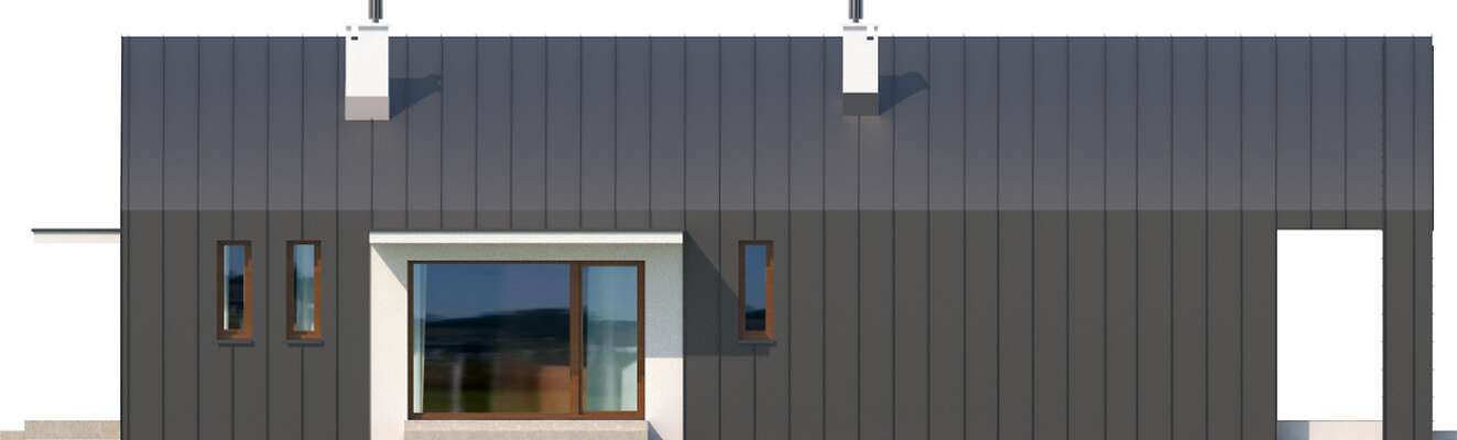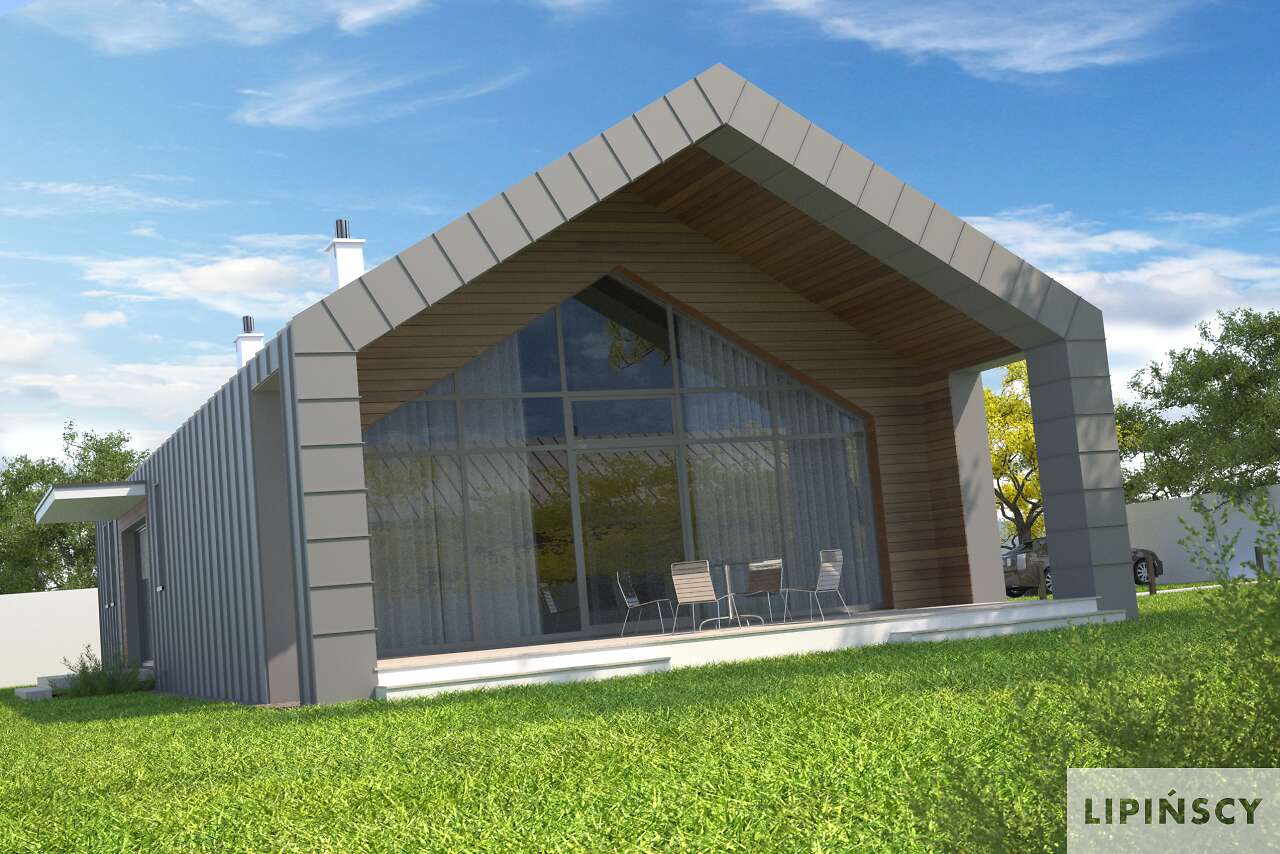 Kompaktowy parterowy dom o wyrazistym, nowoczesnym charakterze. Jest doskonały na działki z wjazdem od wschodu. Taras tego domu jest usytuowany z boku i tworzy wraz z zadaszeniem pokrytym drewnem intrygującą, przestronną przestrzeń. Stylistyka domu jest skierowana do osób o niestandardowych potrzebach estetycznych, dla tych którzy chcą się wyróżnić i podkreślić swoją oryginalność. Jednocześnie jest to dom o niewielkich parametrach powierzchniowych przez co jest atrakcyjny dla ludzi młodych i dla niewielkich rodzin. Wygodnie rozplanowany dom mieści w sobie przestrzeń pokoju dziennego, kuchnię z jadalnia i spiżarką, łazienkę i dwa pokoje, przy czym sypialnia większa ma niepowtarzalny charakter, dzięki dużym przeszkleniom. Dostępna jest również wersja tego projektu z płaskim dachem.