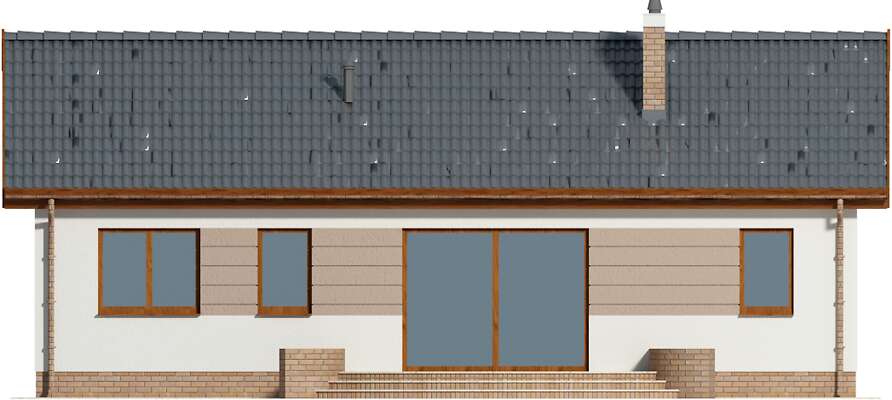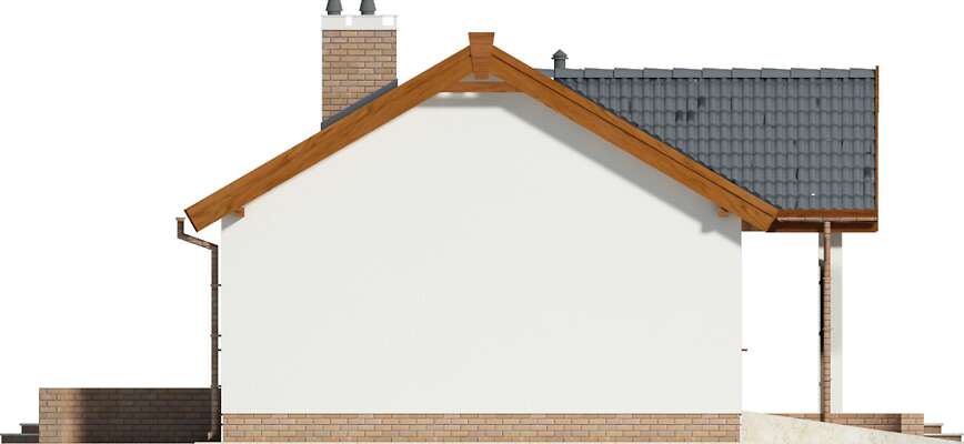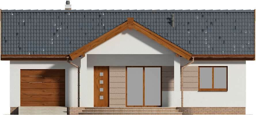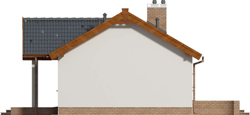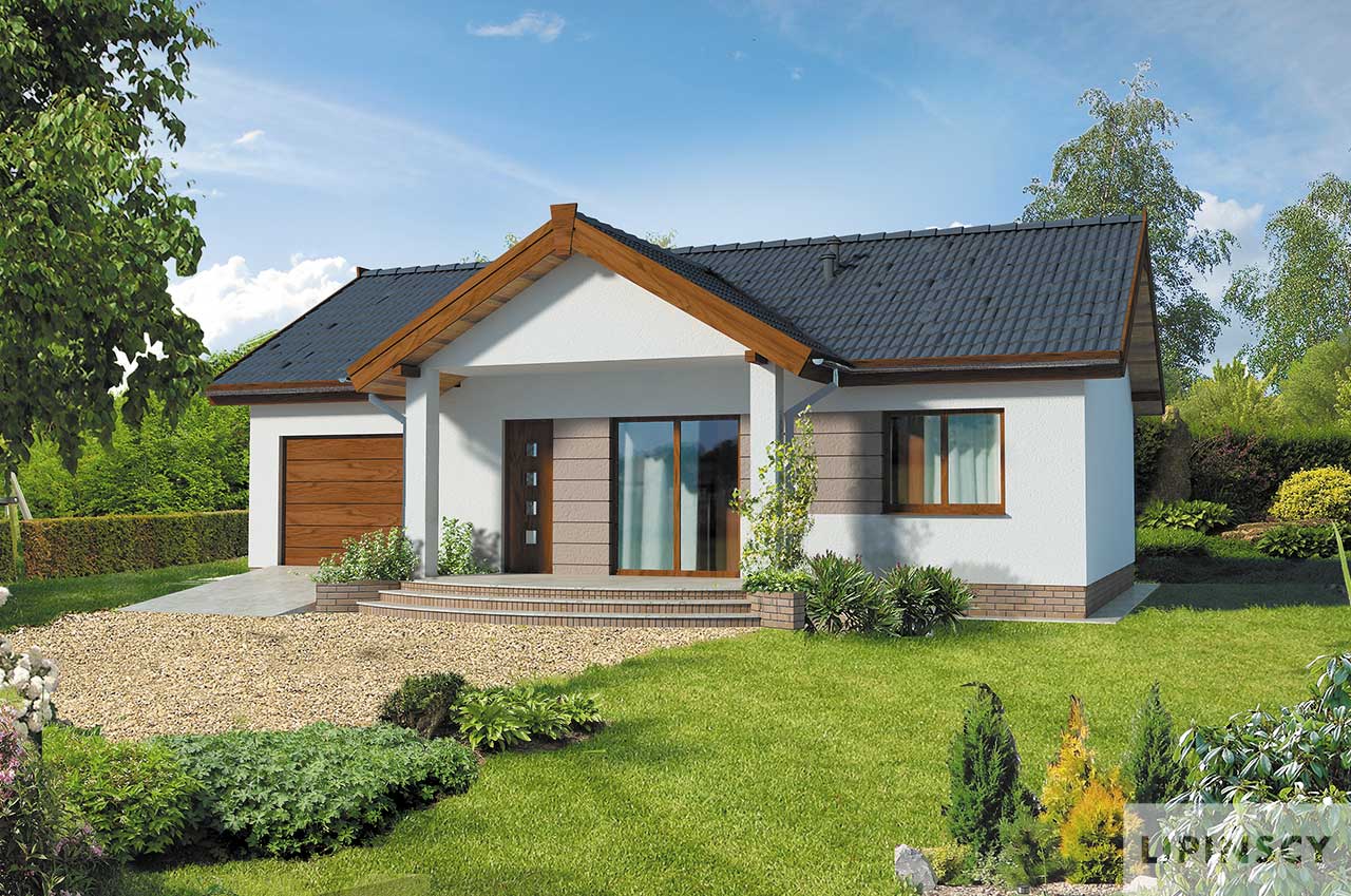 Piękny parterowy dom z dwuspadowym dachem o układzie funkcjonalnym zaprojektowanym z myślą o małej rodzinie. Wyjątkowo w tej wersji projektu kuchnia została zaprojektowana od strony frontowej, z dużym oknem wychodzącym na zadaszony taras wejściowy. Drugi taras znajduje się od strony saloniku otwartego na ogród. W budynku przewidziany jest też jest garaż pod wspólnym dachem, do którego można wejść bezpośrednio z domu. Za garażem znajduje się kotłownia, dzięki temu wnętrze domu to tylko pomieszczenia mieszkalne: pokój dzienny z kuchnią i kominkiem, dwie sypialnie, łazienka. Taki układ funkcjonalny w zupełności wystarczy do wygodnego mieszkania dla młodej rodziny lub seniorów.