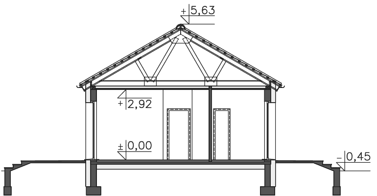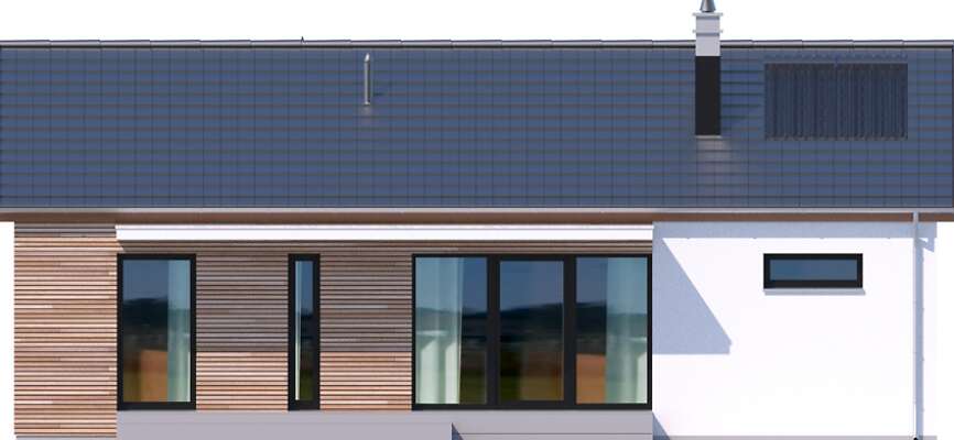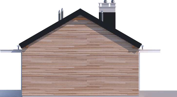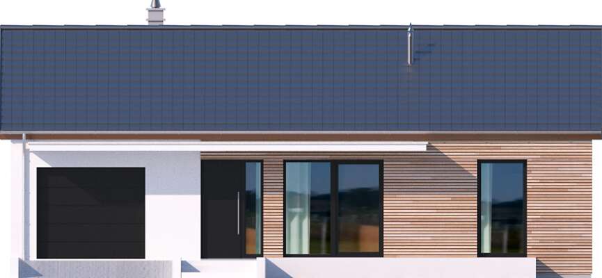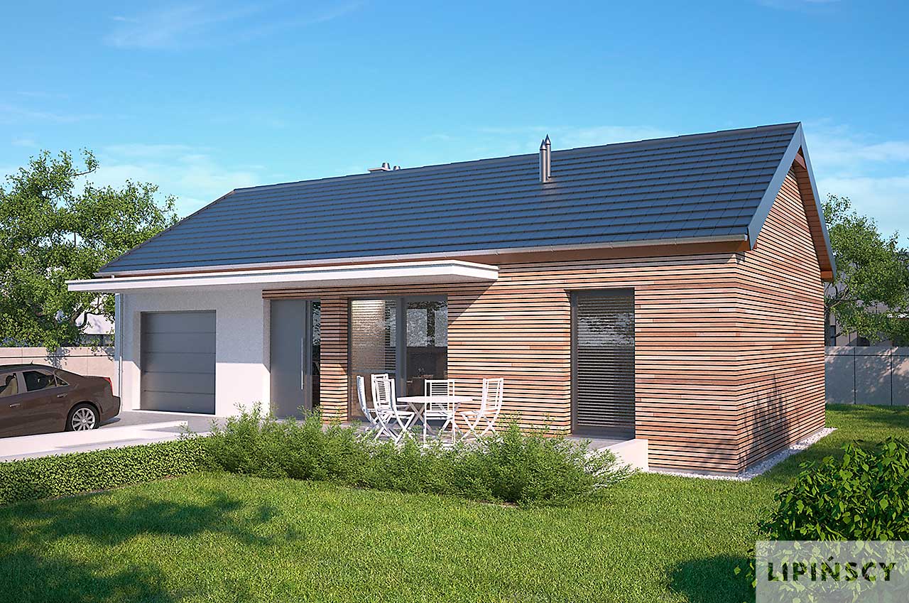 Prosty w budowie dom parterowy z dwuspadowym dachem, idealny dla pary seniorów lub niewielkiej rodziny. Funkcjonalny i przemyślany układ pomieszczeń gwarantuje mieszkańcom wygodne użytkowanie. Ustawną kuchnię z miejscem na rodzinny stół otworzono na salon z kominkiem, z którego można wyjść na zadaszony taras. Znajduje się tu również sypialnia, dodatkowy pokój oraz doświetlona oknem łazienka. W prostą bryłę wpisano garaż na jedno auto, za którym zlokalizowano pomieszczenie gospodarcze z kotłem gazowym. Nowoczesny wygląd nadają domowi przede wszystkim elewacje wykończone drewnem łączonym z białym tynkiem, jedynie minimalnie wysunięty okap dachu, proste zadaszenia tarasów oraz duże przeszklenia o nietradycyjnych formatach. Bardzo praktycznym rozwiązaniem są dwa trasy - wejściowy i ogrodowy, dzięki czemu z wypoczynku na słońcu i świeżym powietrzu będzie można korzystać o każdej porze dnia.