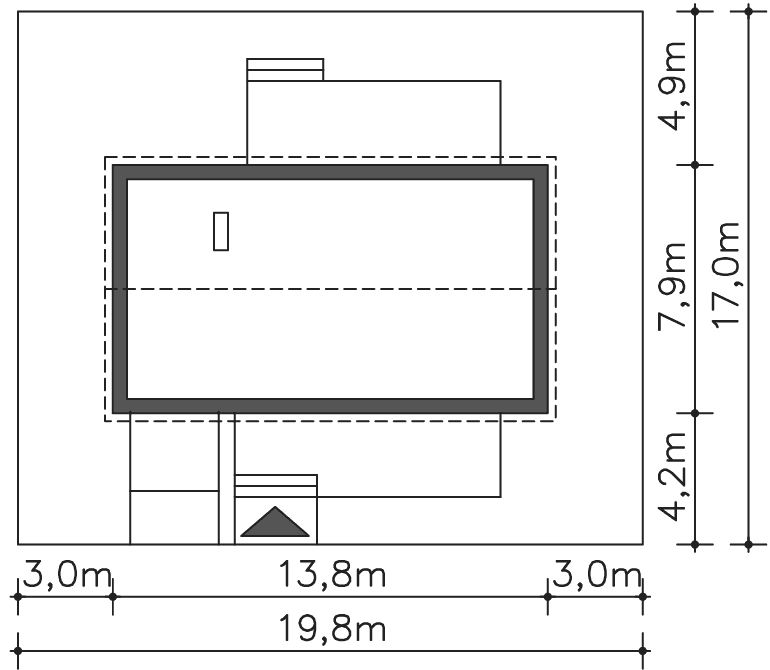 Grafika przedstawia minimalne wymiary działki. Aby sprawdzić, czy dom może być realizowany na konkretnej działce należy uzyskać Wypis i Wyrys z Miejscowego Planu Zagospodarowania Przestrzennego lub jeśli na danym terenie nie ma planu – Decyzję o warunkach zabudowy. Wszystkie projekty wymagają adaptacji do warunków miejscowych przez projektanta lokalnego.