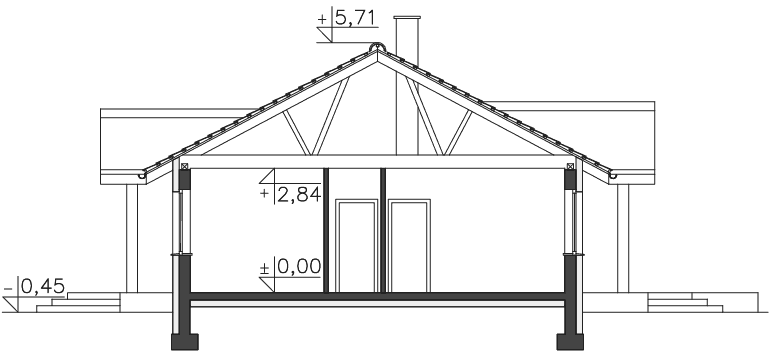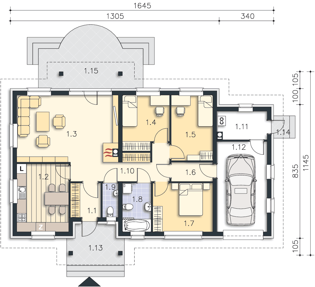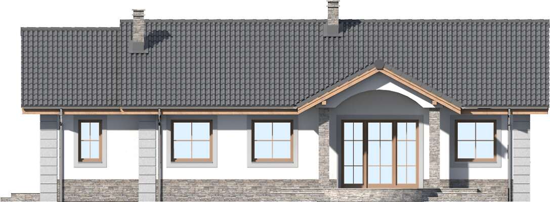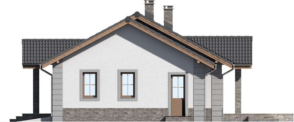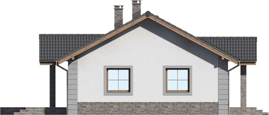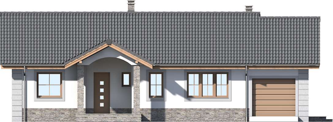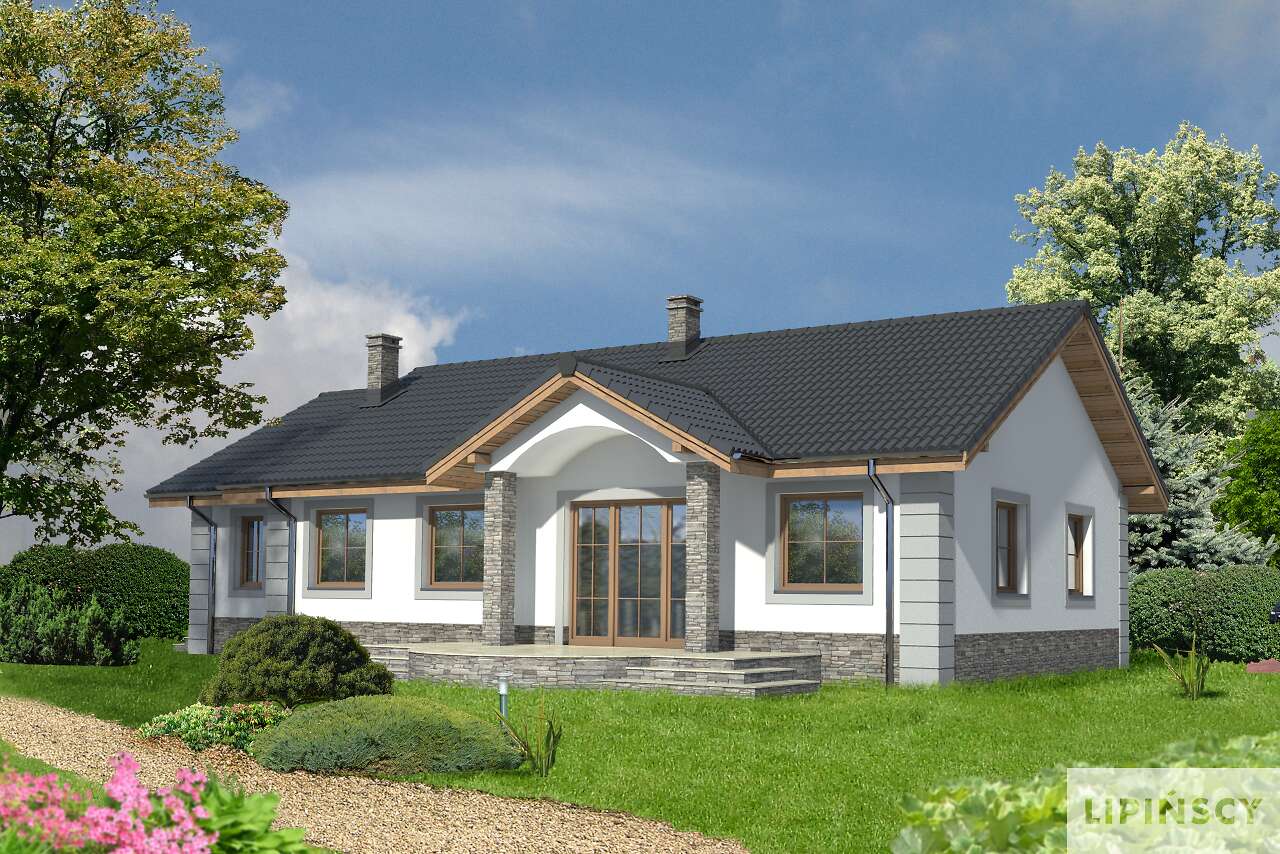 Wygodny dom parterowy, przeznaczony dla trzy, czteroosobowej rodziny. Zadaszone wejście prowadzi do wiatrołapu, gdzie jest miejsce na szafę, która pomieści wierzchnie okrycia. Duży salon z kominkiem i obszerna kuchnia stanowią część wspólną dla domowników. Jest tu także wc. Trzy ustawne sypialnie i duża łazienka to strefa prywatna. Z domu można przejść do garażu, za którym zlokalizowano kotłownię z niezależnym wyjściem na zewnątrz. Ozdobą domu jest duży, zadaszony taras.